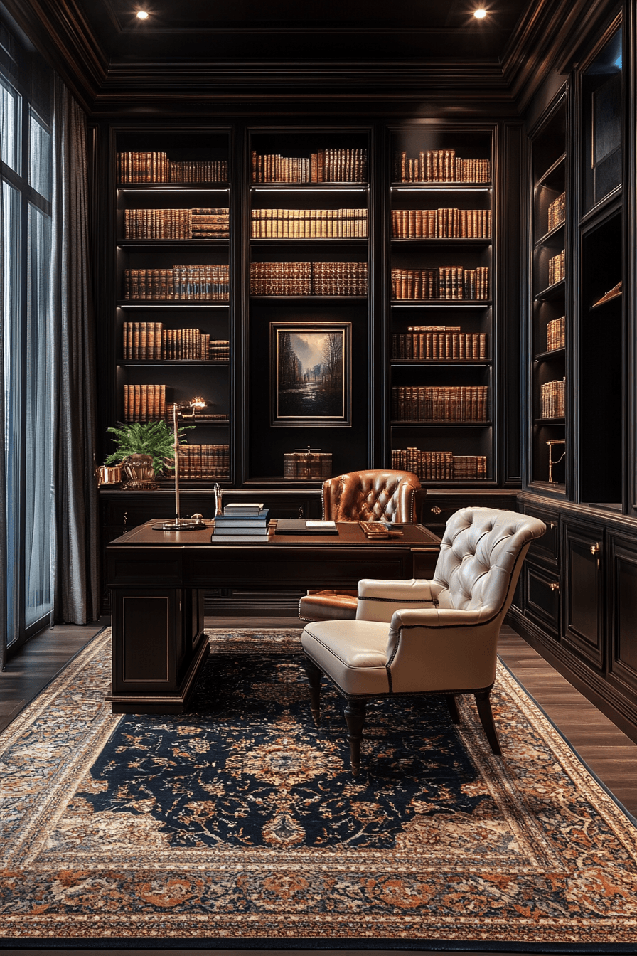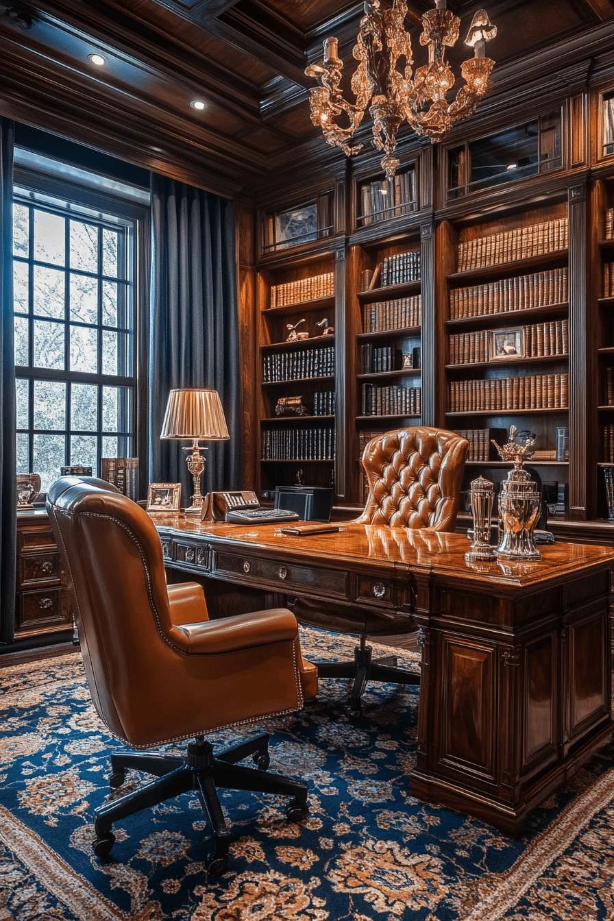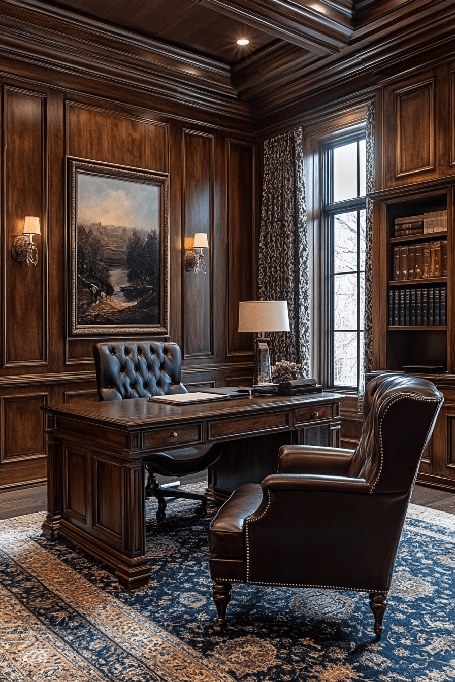 A refined workspace can become the centerpiece of an elegant home office that feels both powerful and inviting. Rich wood tones paired with plush seating create a warm, upscale atmosphere perfect for productivity. Classic shelving and statement decor pieces add character while maintaining a professional feel. Layered textures like rugs and soft lighting enhance the overall comfort of the space. Every detail works together to create a sense of confidence and success. Tap here to explore more executive-style office ideas that elevate your work environment.