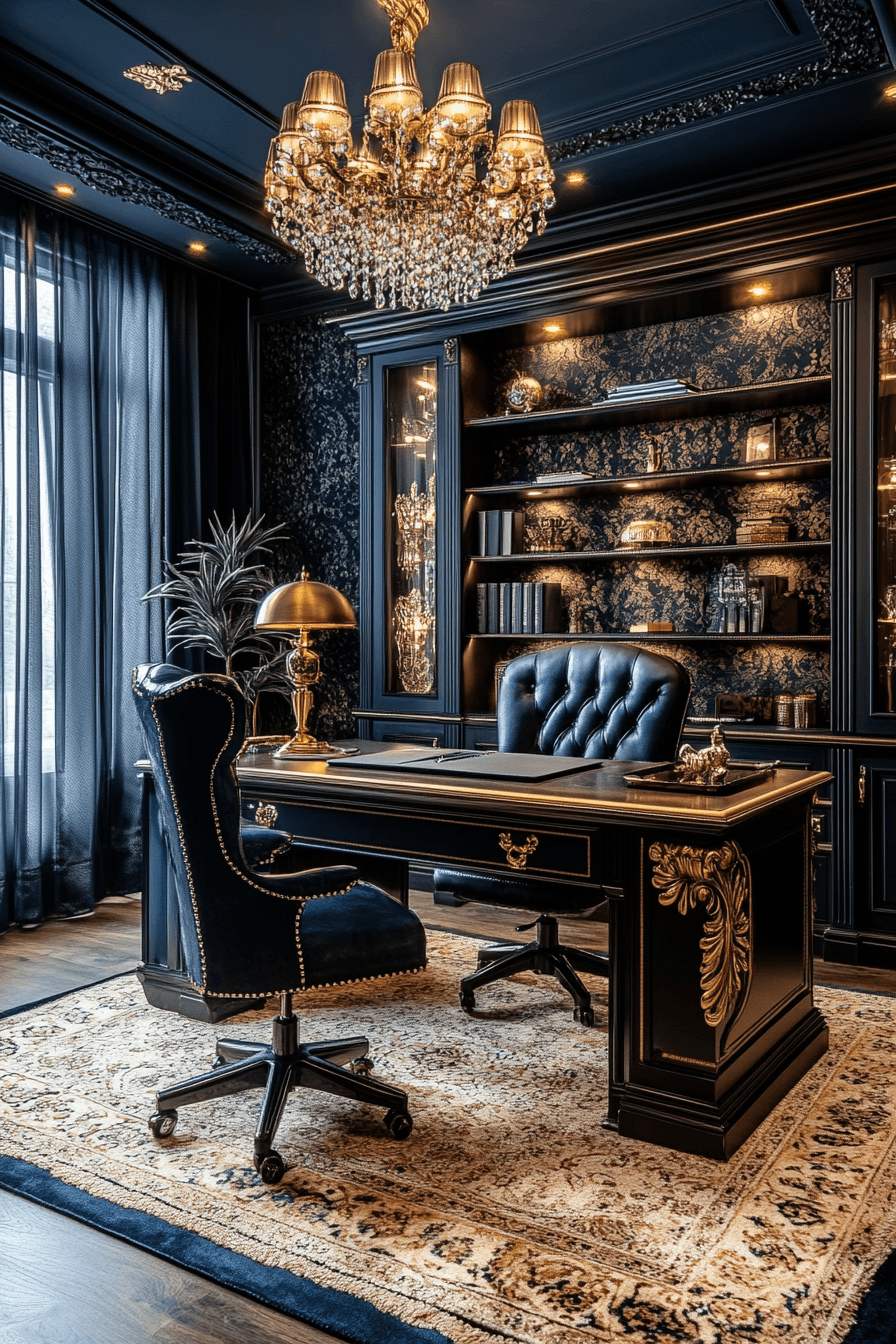 Blending classic drama with modern touches can create an elegant home office that feels unique and full of character. Ornate details and rich textures add depth while contemporary furniture keeps the space functional. Statement lighting pieces bring a sense of glamour without feeling outdated. Carefully balanced patterns and materials keep the room visually interesting yet cohesive. This style is perfect for those who enjoy a bold, expressive workspace. Tap to discover more ideas that mix classic charm with modern design.
