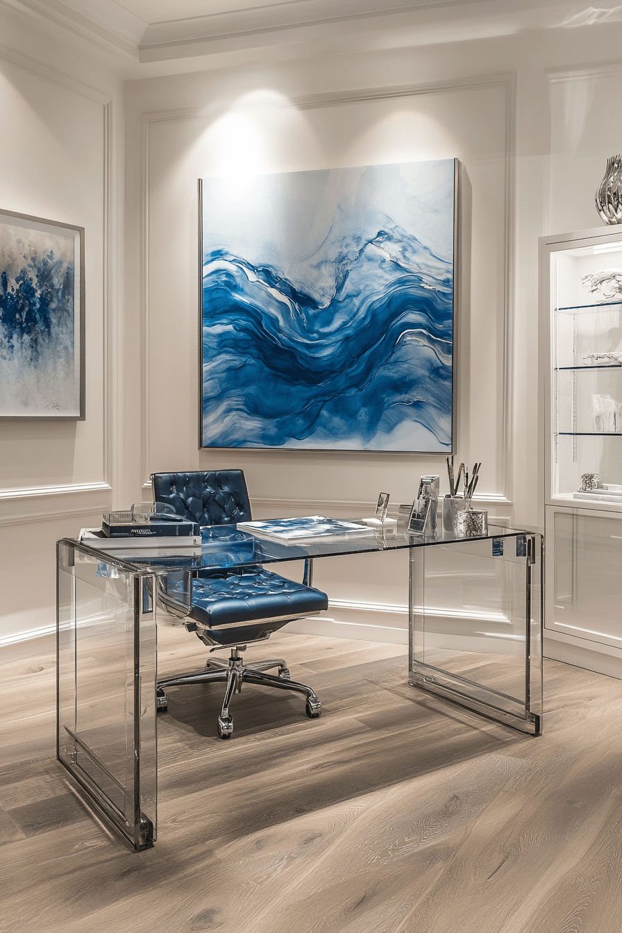 Using transparent elements can give your elegant home office a light, airy feel that instantly makes the space look larger. A glass desk becomes a stunning focal point while keeping the room visually uncluttered. Pairing it with simple furniture and metallic accents adds a modern, polished vibe. Carefully chosen lighting can enhance the reflective surfaces and create a soft glow throughout the room. This approach is perfect for maintaining a clean and organized workspace without sacrificing elegance. Tap to discover more ideas that bring brightness and style into your office.