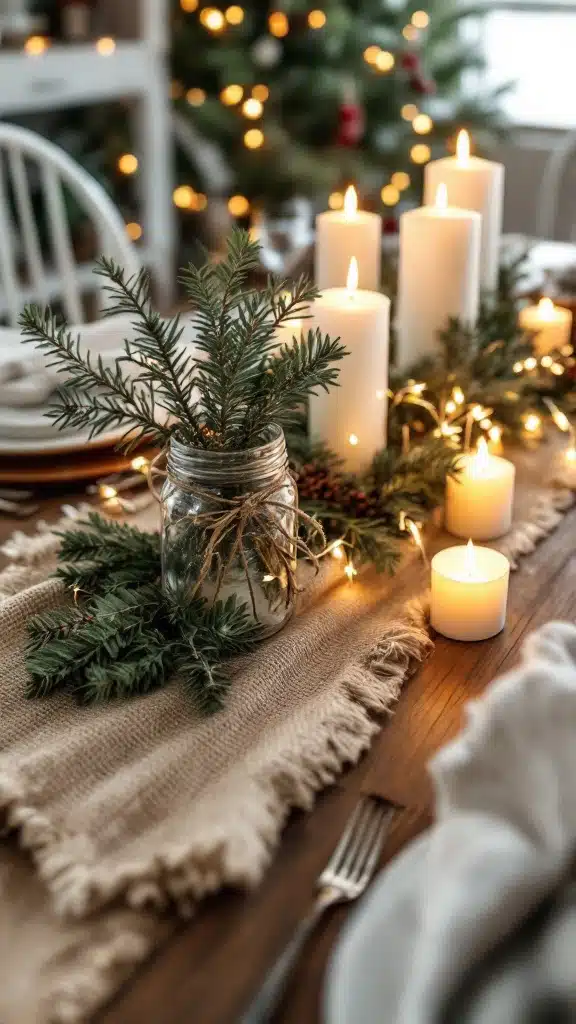The Rustic Burlap and Evergreen Centerpiece evokes a cozy, farmhouse charm with its earthy burlap runners, clear mason jars, and vibrant evergreen sprigs. The color palette—neutral burlap, fresh green, and crisp white from pillar candles—creates a serene yet inviting atmosphere.