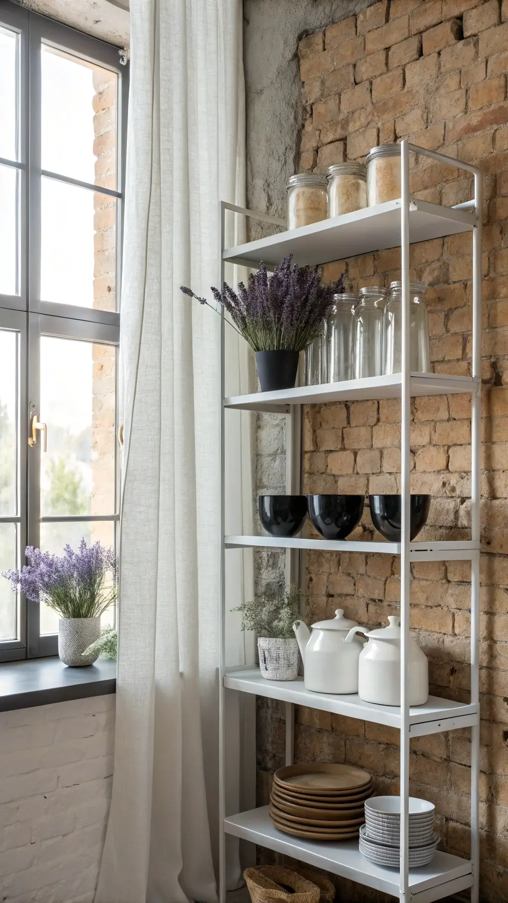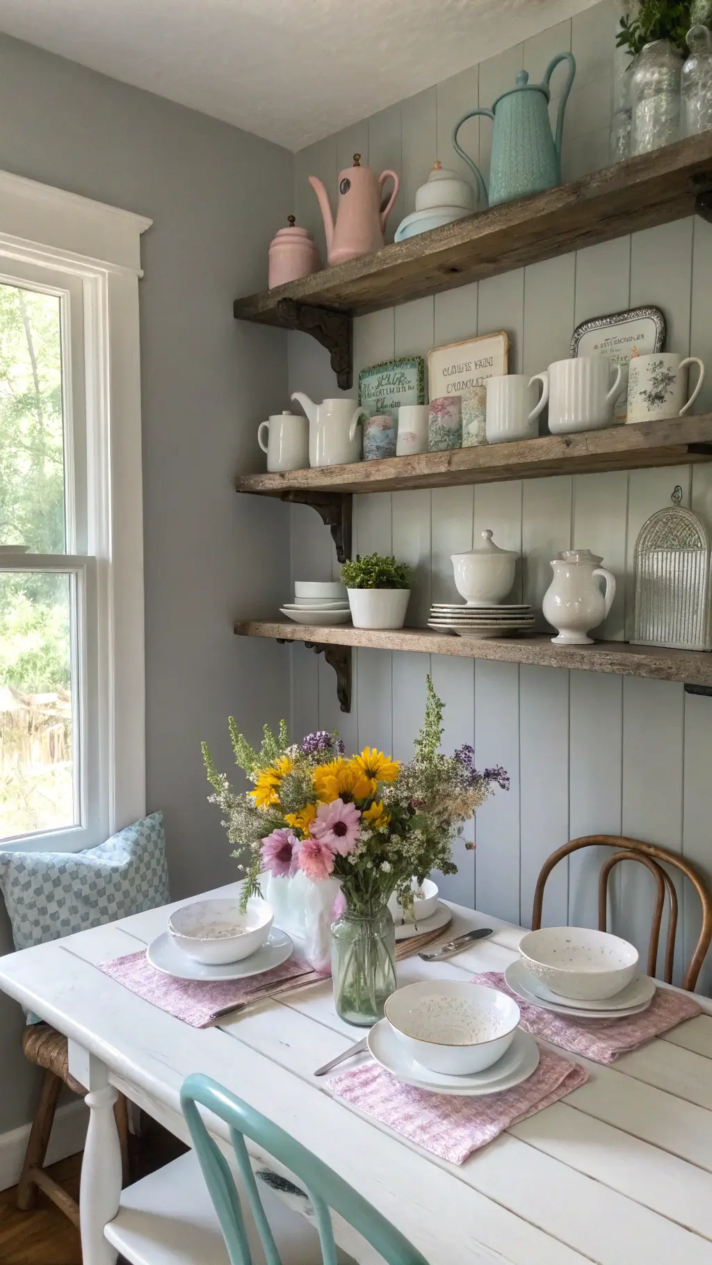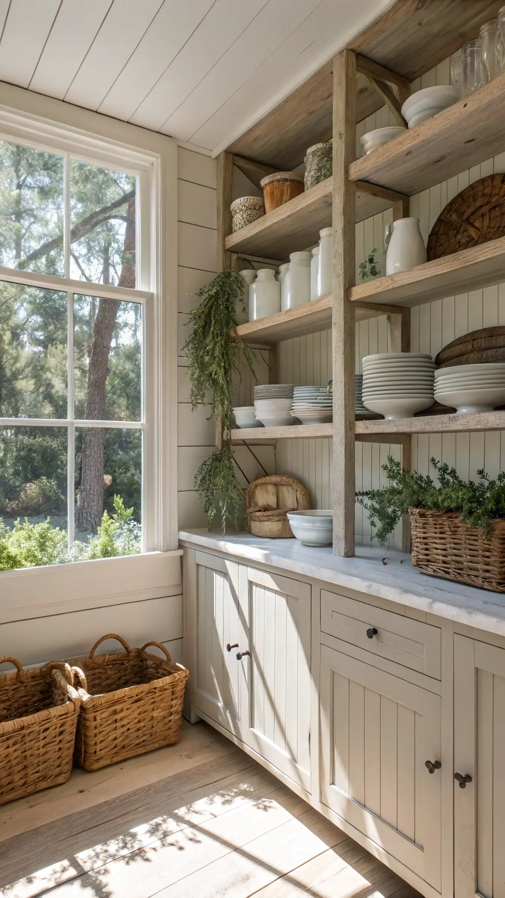 SEO Keywords: farmhouse kitchen shelves, open shelving ideas, rustic kitchen decor, DIY shelf styling, cottage kitchen design