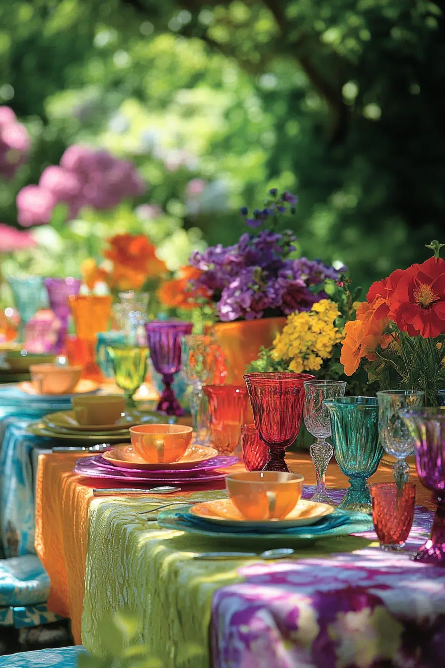 Bright colors can instantly liven up any garden party and create an inviting, cheerful atmosphere. Using bold tablecloths, colorful glassware, and eye-catching centerpieces will make your outdoor dining space feel fun and festive. These simple additions enhance the beauty of nature while keeping the decor effortlessly stylish.