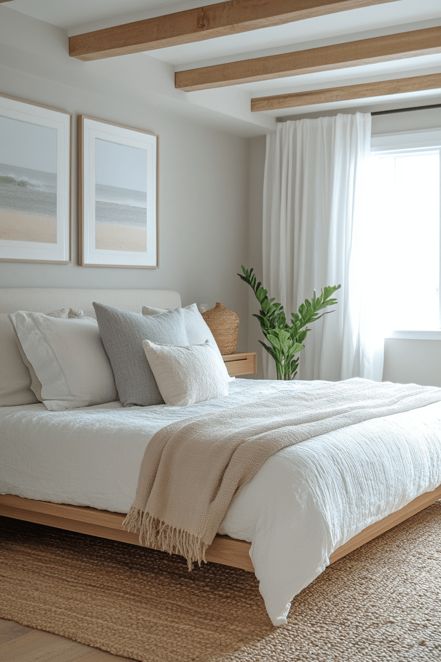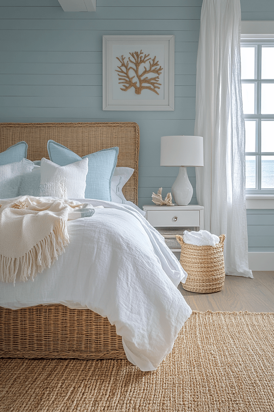 Create your own seaside sanctuary with breezy coastal guest room ideas inspired by sun, sand, and salt air. Pale blues, driftwood textures, and airy fabrics invite calm and relaxation. Woven baskets and soft linen curtains complete the look. It’s like waking up in a beach cottage every day.