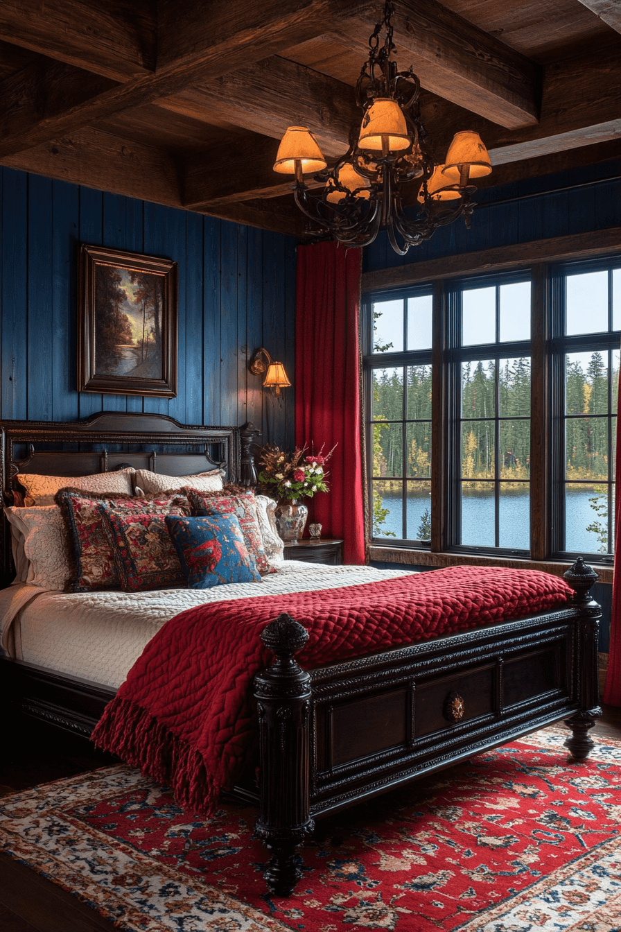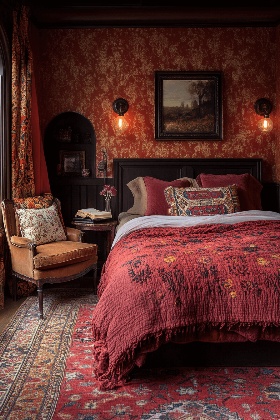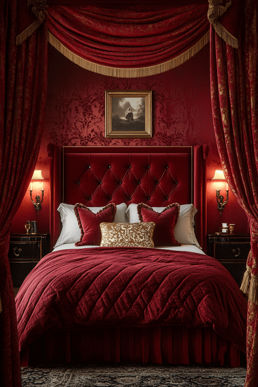 Dramatic and regal, rich red guest room ideas set the stage for luxury. Plush fabrics, gold accents, and ornate decor create a stunning visual impact. The lighting glows softly against deep hues. It’s warmth with a touch of royalty.