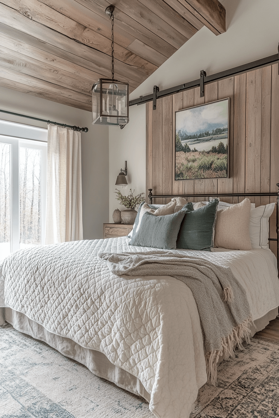 Bring farmhouse coziness to life with modern rustic guest room ideas that blend comfort and style. Shiplap walls, cozy quilts, and reclaimed wood mix seamlessly with sleek modern touches. The balance feels both fresh and familiar. It’s comfort that looks curated.