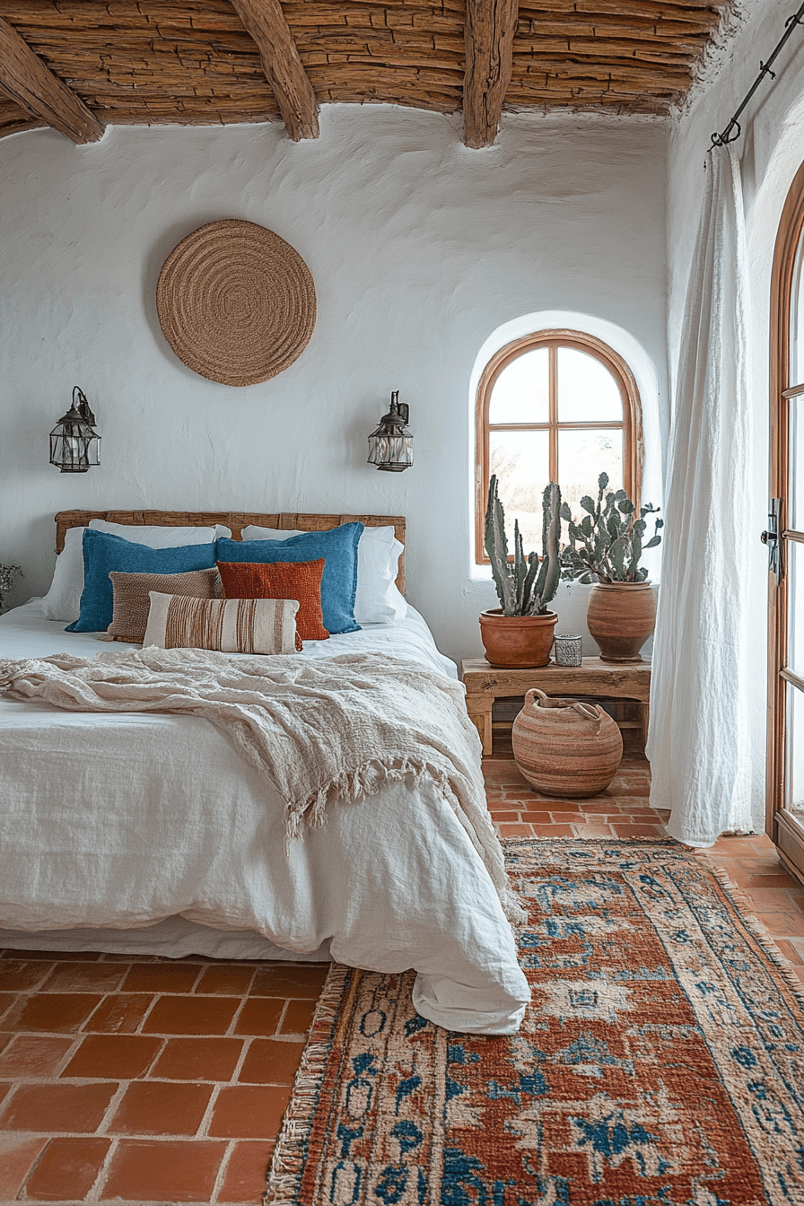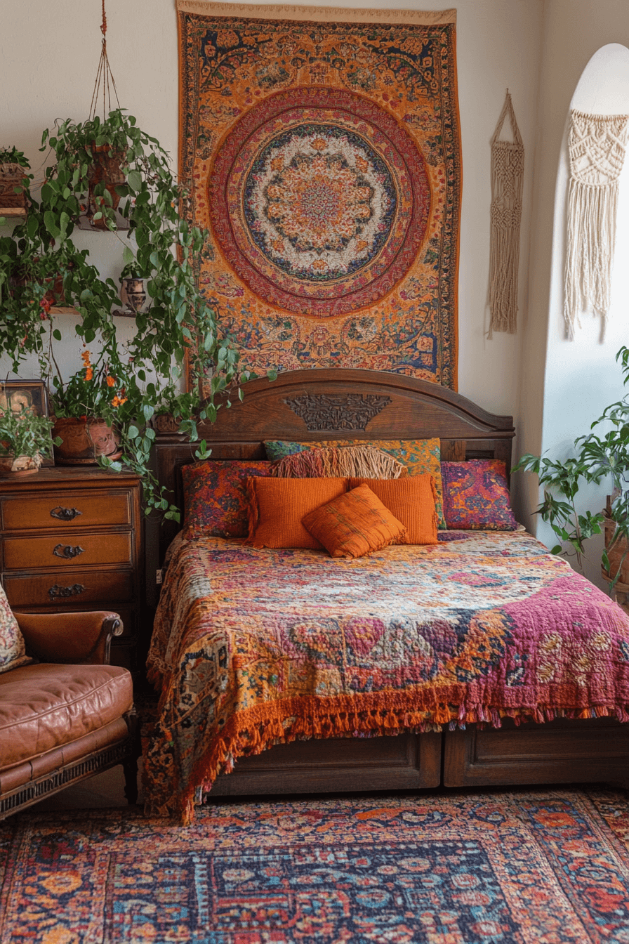 Infuse joy and creativity into your home with colorful bohemian guest room ideas bursting with personality. Think layered rugs, macramé wall art, and cozy pillows in every shade of the rainbow. Rattan accents and leafy plants make the space feel vibrant yet grounded. Each corner tells a carefree story of warmth and wanderlust.