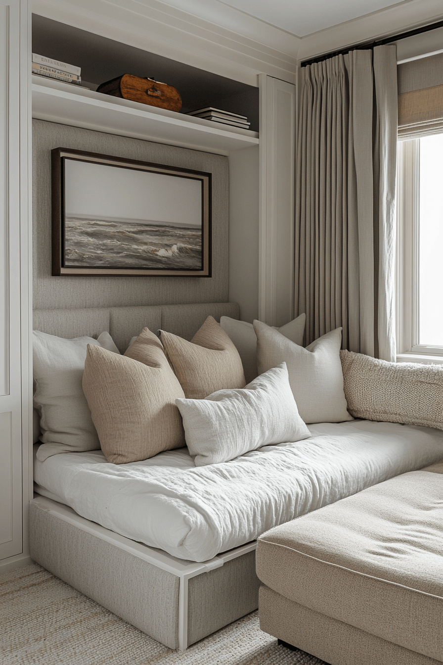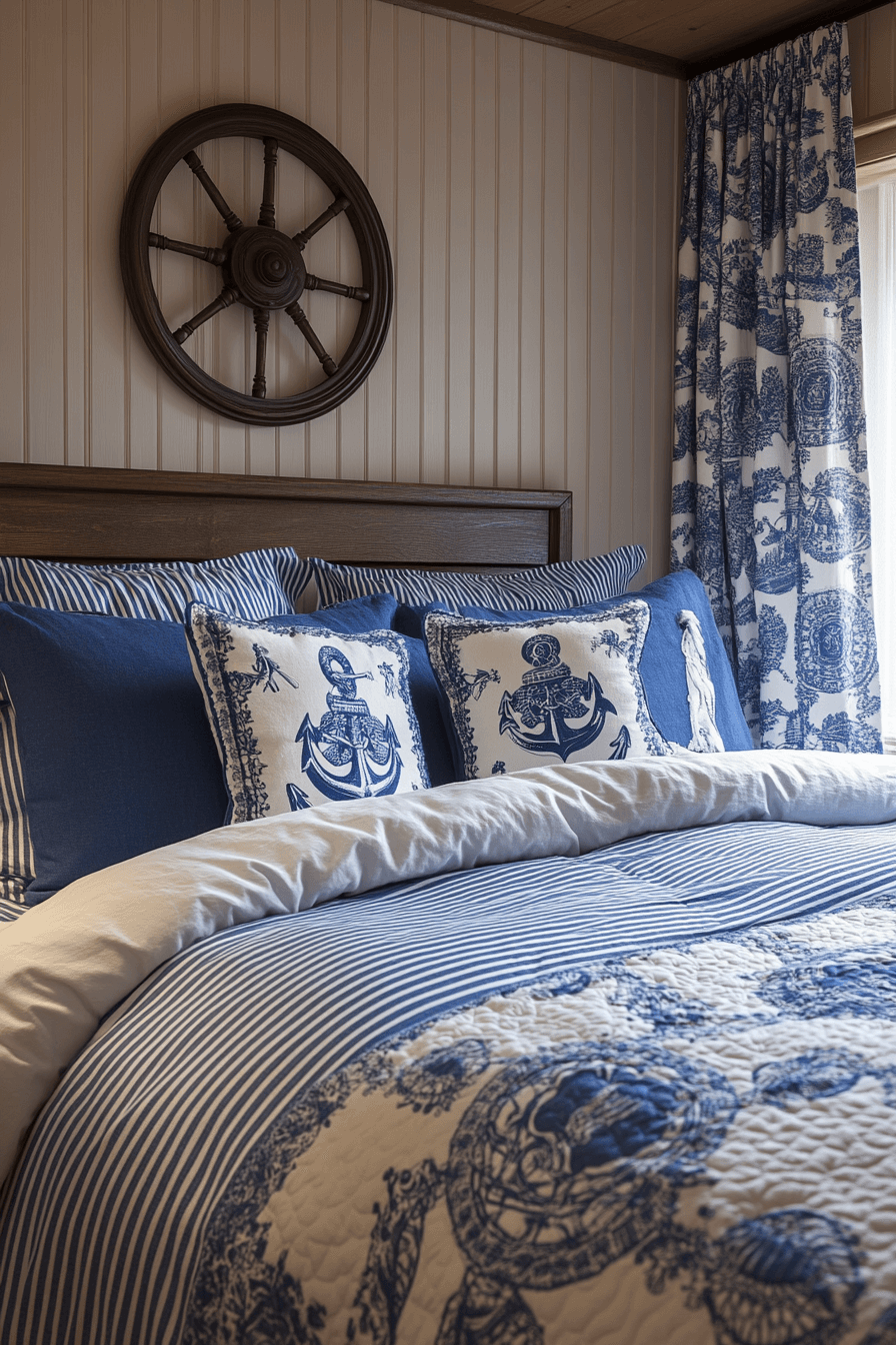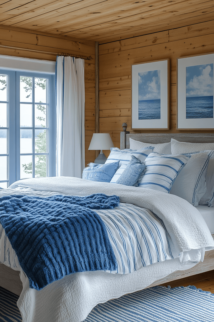 Bring coastal calm indoors with nautical guest room ideas that echo ocean breezes and seaside serenity. Soft blues, sandy whites, and rope accents create a charming maritime mood. A cozy window seat and sea-inspired decor make guests feel like they’ve drifted into a beach cottage dream. Every detail feels fresh and timeless.