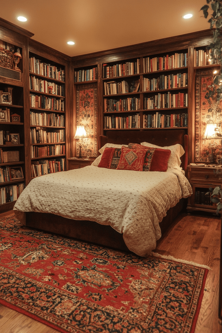 Blend books and comfort with library-inspired guest room ideas that wrap your visitors in literary luxury. Floor-to-ceiling shelves, soft leather chairs, and warm light create the ultimate cozy corner. Every guest feels instantly at home. It’s charm with a dash of intellect.
