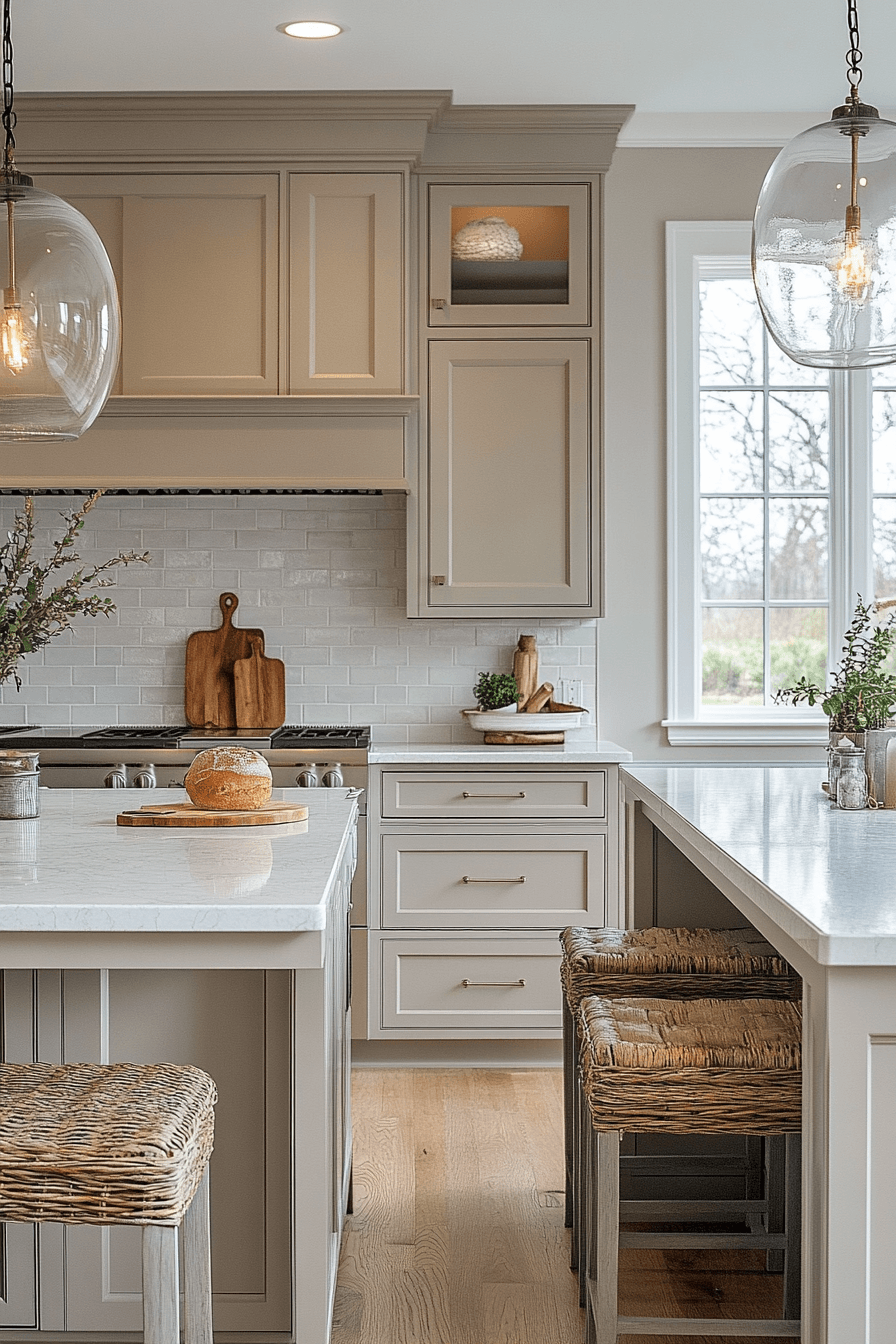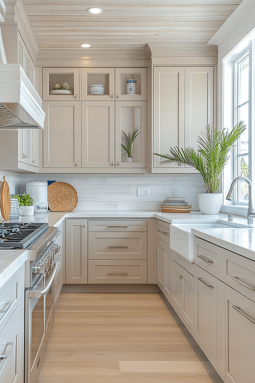 A breezy and refreshing kitchen atmosphere emerges when light taupe kitchen cabinets introduce a soft coastal vibe. Their sandy taupe tone pairs beautifully with airy blues, pale woods, and crisp white accents. The gentle neutral shade instantly brightens the room and creates a relaxed seaside-inspired mood. Decorative touches like woven textures or ocean-toned accessories feel perfectly at home alongside this color palette. Light taupe kitchen cabinets help turn everyday cooking spaces into calm coastal escapes. Dive into more beach-inspired kitchen ideas to bring this breezy style home.