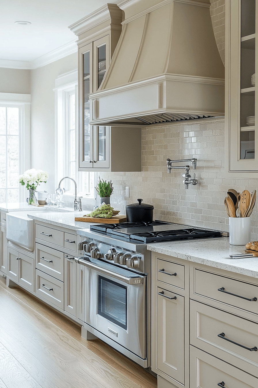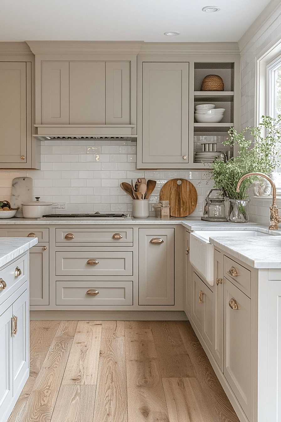 Balance and harmony shine through when light taupe kitchen cabinets anchor a calm and cohesive kitchen design. The soft neutral shade blends effortlessly with wood flooring, metal fixtures, and a variety of décor elements. This color helps create a relaxing atmosphere that feels both modern and welcoming. As a versatile backdrop, taupe allows other textures and finishes to subtly stand out. Light taupe kitchen cabinets make it easy to design a kitchen that feels peaceful and visually balanced. Explore more harmonious taupe kitchen ideas for inspiration.