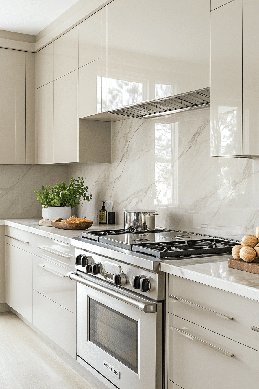 A sleek and contemporary vibe comes alive when light taupe kitchen cabinets feature a smooth polished finish. The reflective surface gently bounces light throughout the room, making the kitchen appear brighter and more spacious. This refined look pairs perfectly with streamlined hardware and modern appliances. Minimal décor allows the smooth cabinetry to remain the visual highlight. Light taupe kitchen cabinets bring a fresh and modern energy into the space while still feeling warm and inviting. Discover more polished taupe cabinet styles that elevate modern kitchens.