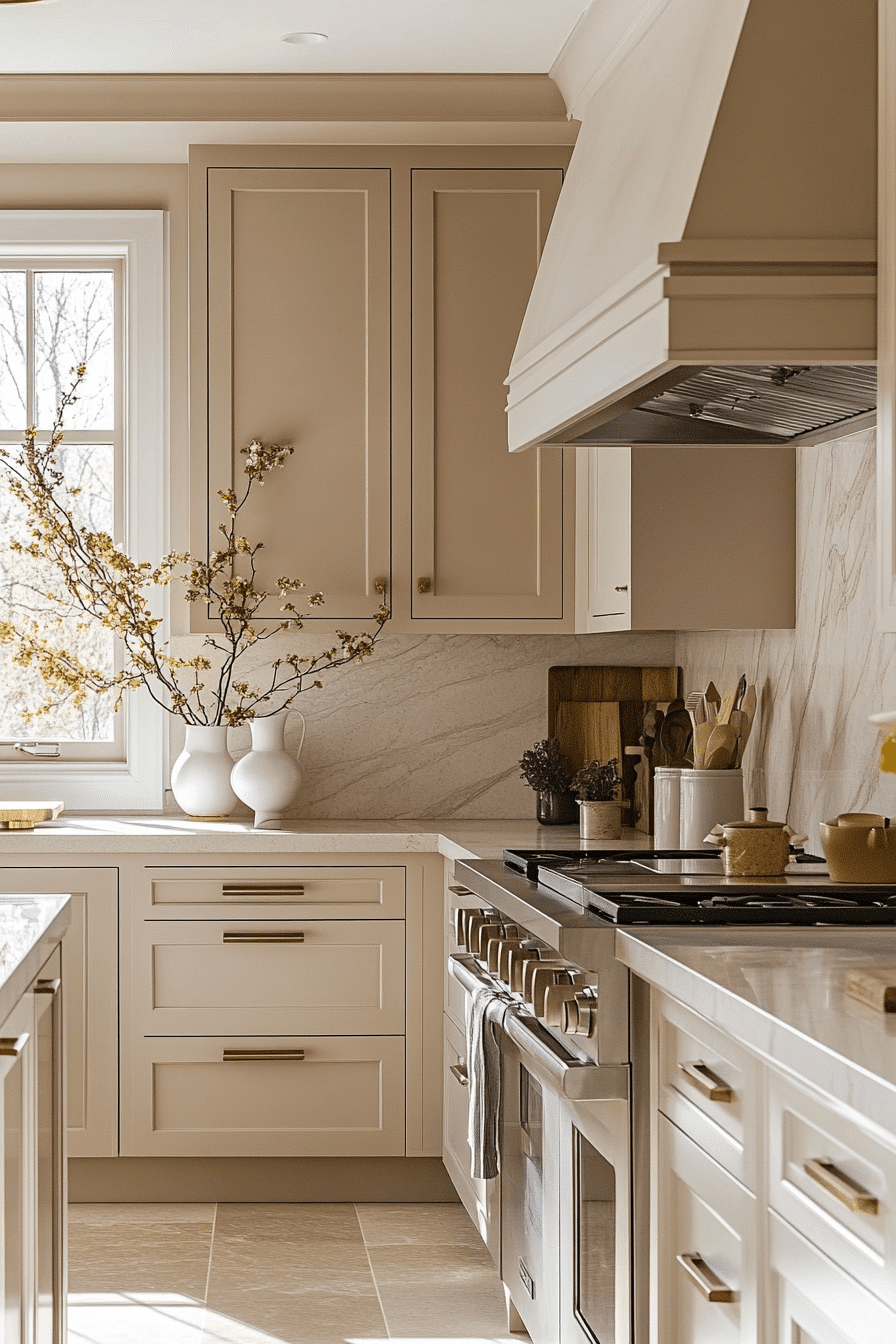 An open and airy feeling fills the room when light taupe kitchen cabinets brighten the kitchen with their soft neutral tone. The gentle shade reflects light beautifully, making the space feel larger and more inviting. This makes taupe cabinetry especially helpful in smaller kitchens or rooms with limited natural light. Pairing them with white accents or pale woods enhances the light and spacious look. Light taupe kitchen cabinets create a fresh and uplifting atmosphere for everyday living. Explore more bright and airy taupe kitchen ideas to transform your space.