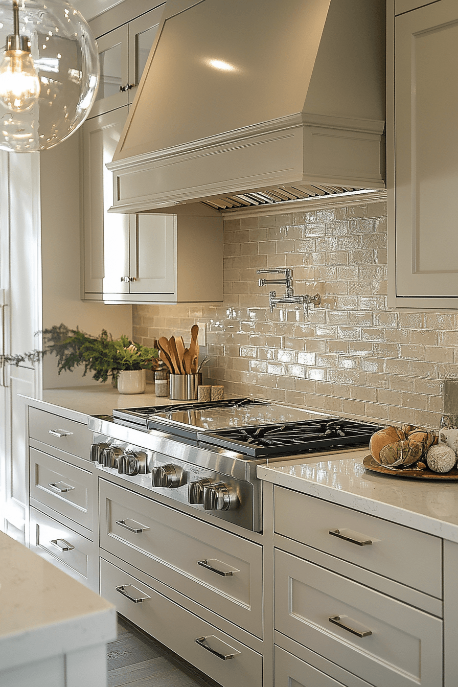 A sleek modern kitchen shines when light taupe kitchen cabinets pair effortlessly with polished chrome accents. The warm neutral taupe beautifully balances the cool shine of chrome handles, faucets, and fixtures. This combination creates a stylish contrast that feels fresh and contemporary. Chrome surfaces also bounce light around the room, making the kitchen feel brighter and more spacious. Light taupe kitchen cabinets deliver both warmth and modern elegance in this striking pairing. Explore more taupe and chrome kitchen designs that elevate contemporary style.