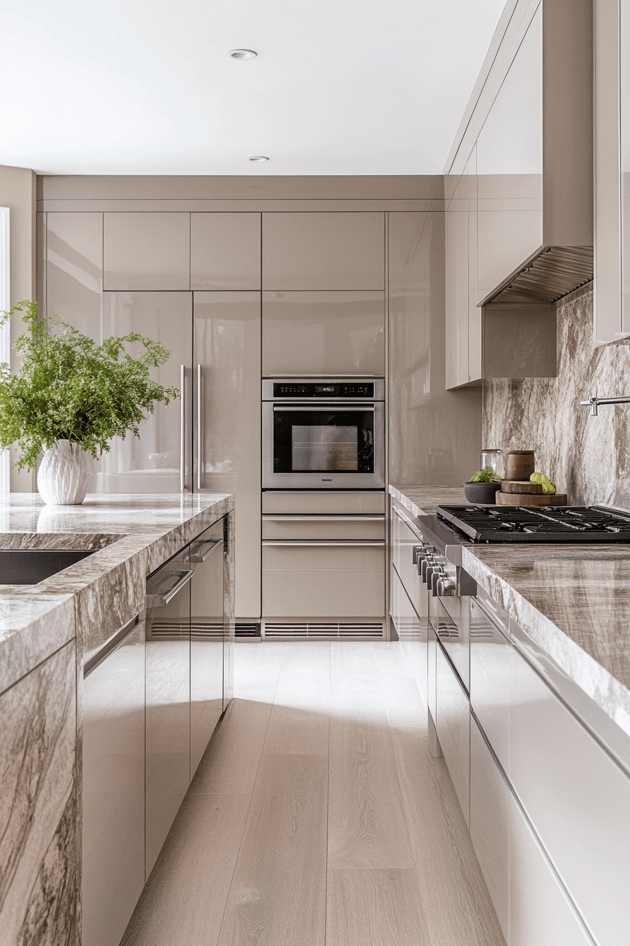 A sleek and contemporary vibe comes alive when light taupe kitchen cabinets feature a smooth polished finish. The reflective surface gently bounces light throughout the room, making the kitchen appear brighter and more spacious. This refined look pairs perfectly with streamlined hardware and modern appliances. Minimal décor allows the smooth cabinetry to remain the visual highlight. Light taupe kitchen cabinets bring a fresh and modern energy into the space while still feeling warm and inviting. Discover more polished taupe cabinet styles that elevate modern kitchens.