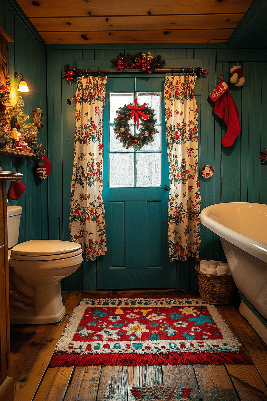Let your bathroom burst with brightness and color this little cabin Christmas. Bold towels, cheerful décor, and glowing lights transform an ordinary space into pure joy. A wreath on the door and warm lighting bring an instant smile. Every corner radiates the season’s happiness.