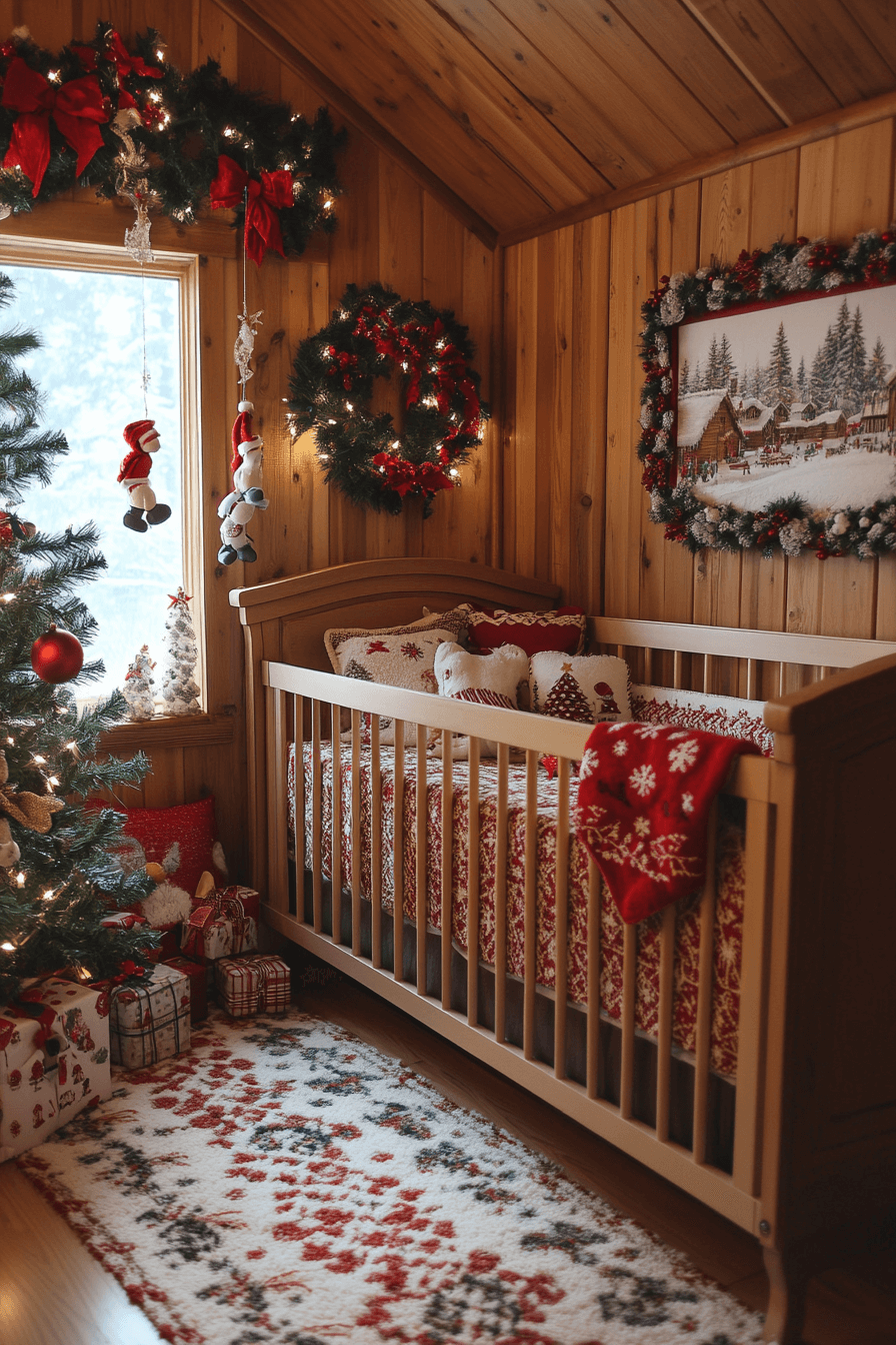 Create a nursery where warmth and wonder fill every corner of your little cabin Christmas. Soft twinkle lights, red accents, and plush fabrics make it a safe, magical space. Gentle scents of pine and vanilla bring calm and comfort. Every detail feels cozy, happy, and full of love.