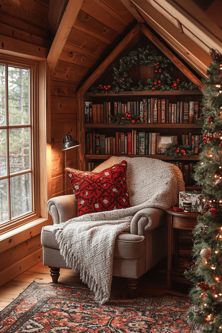 Craft a reading nook that captures the magic of your little cabin Christmas. A comfy chair, warm blanket, and glowing lamp make it the perfect hideaway. Shelves of Christmas classics and the scent of cocoa complete the picture. Snowy views outside add pure serenity.