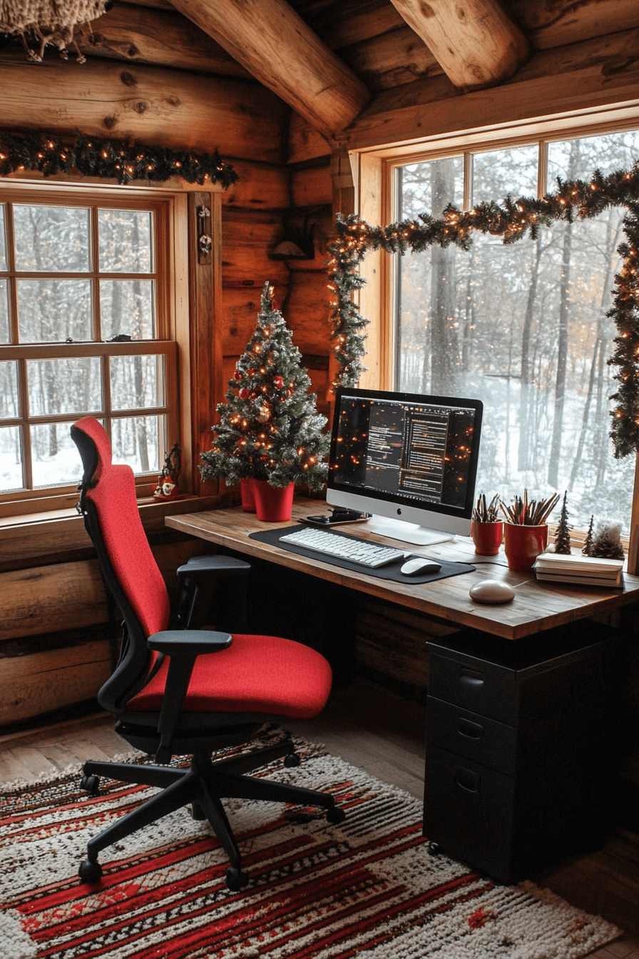 Stay inspired all season long with a little cabin Christmas home office that balances joy and focus. A mini Christmas tree, garlands, and red details bring cheer to your workspace. Natural light and cozy textures make every task feel pleasant. The calm holiday glow keeps motivation high.