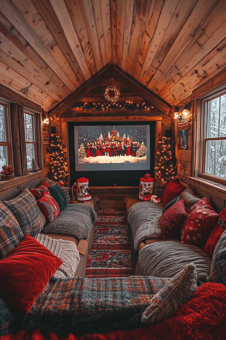 Turn movie night into a holiday tradition with your little cabin Christmas cinema room. Soft sofas, flickering lights, and fuzzy blankets set the mood for cozy evenings. A popcorn bar adds fun and nostalgia to every film. Holiday posters and décor complete the festive atmosphere.