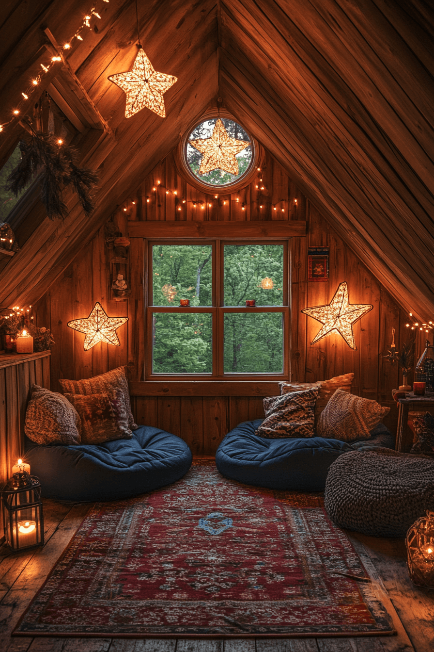 Turn your attic into a glowing retreat under a sky of lights for your little cabin Christmas. Draped string lights twinkle across the beams, creating a dreamy atmosphere. Floor cushions and soft blankets invite lazy afternoons and storytelling. The glow feels magical yet peaceful.