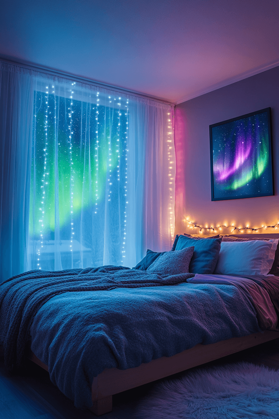 Create a bedroom that glows like the aurora with your little cabin Christmas décor. Shades of blue, green, and violet dance through soft linens and gentle lighting. Northern Lights artwork enhances the dreamy, ethereal feel. Plush rugs and warm throws make every evening cozy.