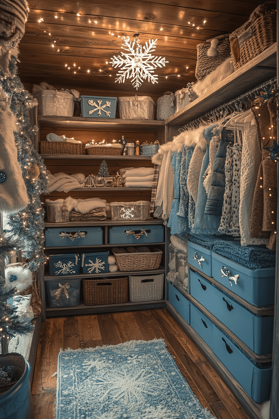 Bring sparkle to your storage with a little cabin Christmas closet that’s both pretty and practical. Snowflake hooks, twinkle lights, and patterned bins turn organization into art. Shelves lined with festive paper make everything look merry and neat. Even your winter wear feels special in this cheerful space.