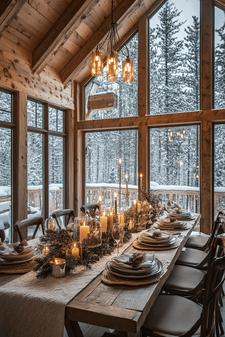 Enjoy winter’s beauty with a dining space that feels straight out of a snow globe. Your little cabin Christmas dining room shines with glowing candles, soft runners, and a view of frosted trees. The cozy seating invites guests to linger long after the last bite. Warm lighting dances across the table, creating pure holiday magic.