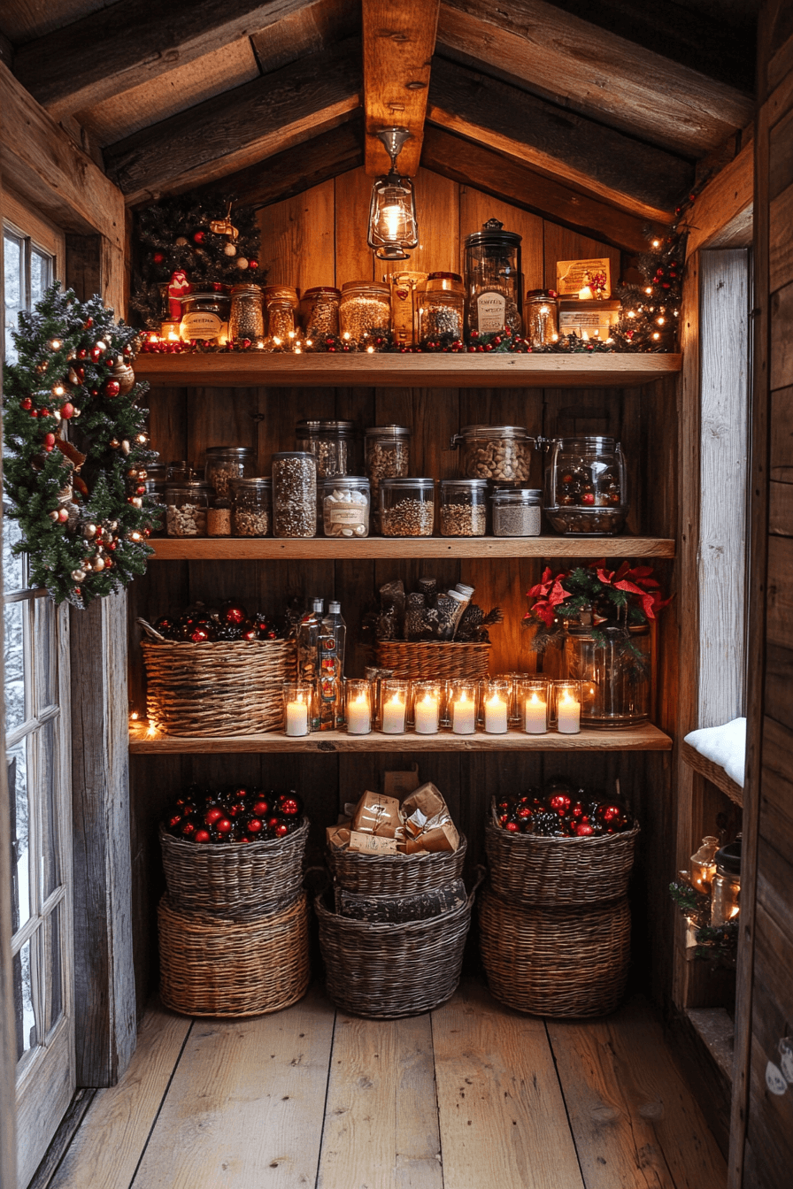 Light up your pantry with the cozy warmth of a little cabin Christmas glow. Flickering LED candles cast a golden light over jars and baskets. Pine branches and red ribbons add festive flair. Even simple ingredients feel special in this charming space.
