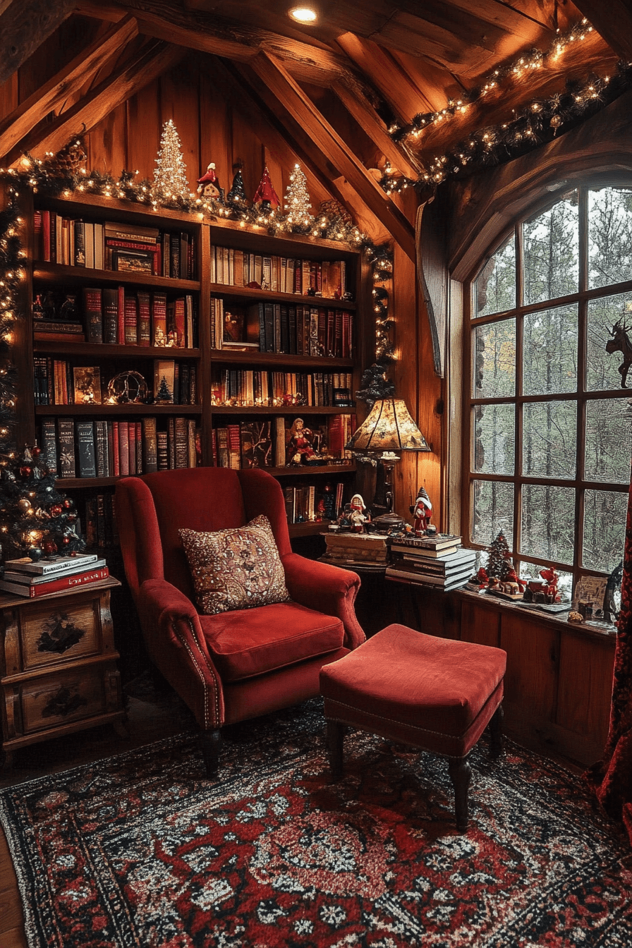 Immerse yourself in the magic of books and light with an enchanted library made for your little cabin Christmas. Shelves wrapped in twinkling fairy lights create an atmosphere of wonder. A comfy chair and plush rug turn reading into a luxury. Every page feels alive with holiday inspiration.