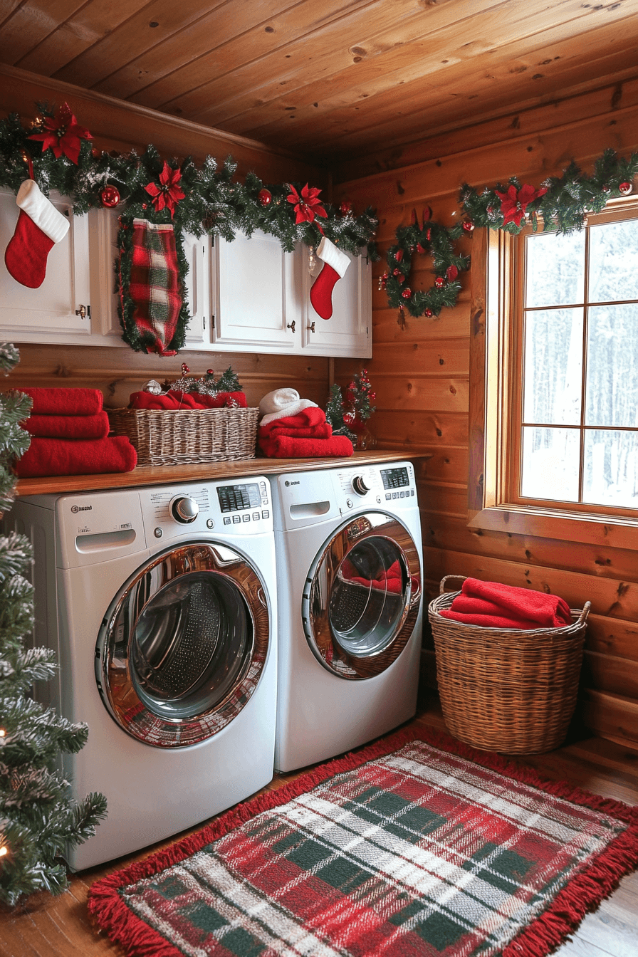 Make laundry time merry with a little cabin Christmas laundry room filled with festive charm. Small sleigh bells on handles jingle as you go about your chores. Red and green towels brighten the space instantly. Soft lights and cheerful mats make even folding clothes feel fun.