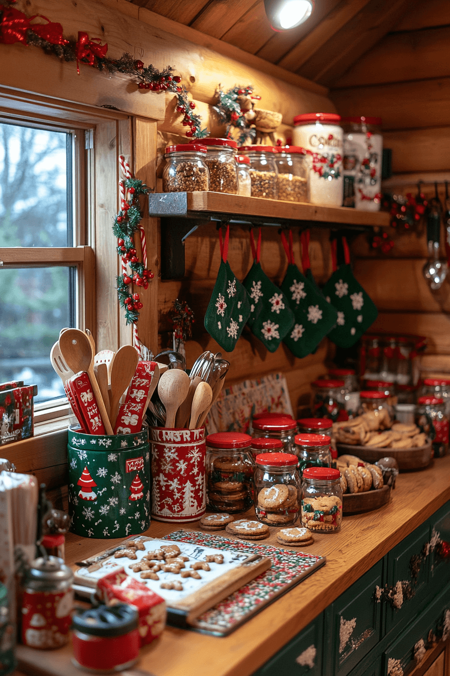 Bake happiness into every moment with a little cabin Christmas cookie kitchen. Red utensils, festive jars, and holiday cutters make baking a delightful experience. The air fills with sweet scents and laughter as cookies come out golden and warm. Every detail radiates cozy nostalgia.