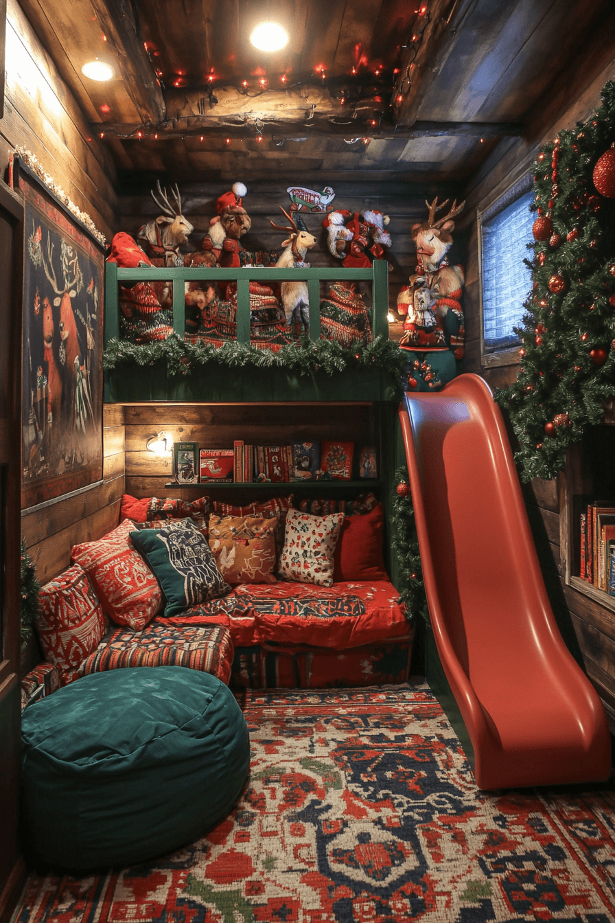 Turn your playroom into a magical hub of fun with your little cabin Christmas flair. Plush reindeer, colorful garlands, and cheerful games keep the holiday spirit alive. Soft rugs and cozy corners invite story time between play. The air buzzes with laughter and imagination.