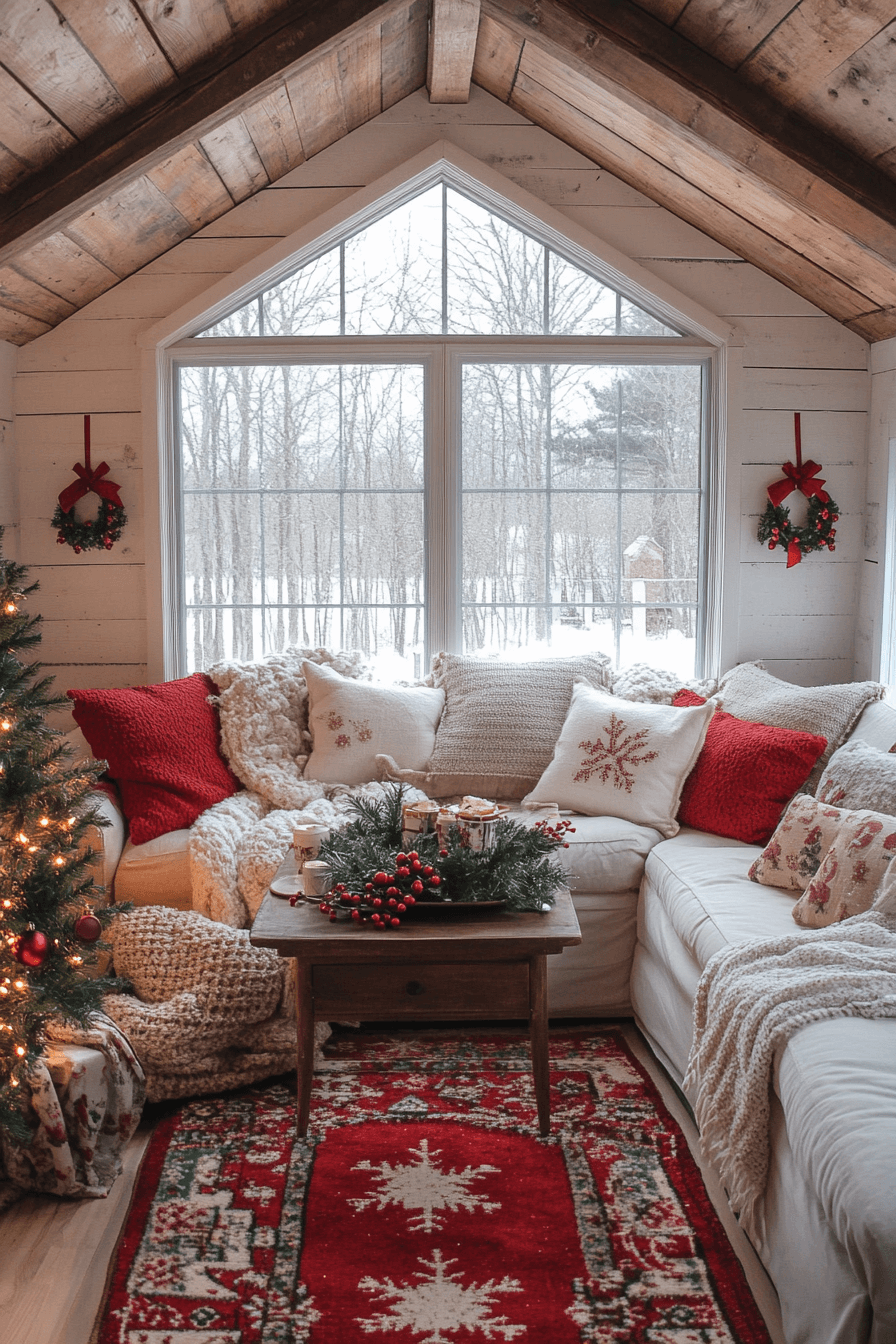 Wake up to joy in a sunroom glowing with little cabin Christmas warmth. Natural light, soft fabrics, and snowflake details create the perfect Christmas morning setting. Warm cocoa and pastries add extra coziness to gift-opening time. The atmosphere feels peaceful yet full of excitement.