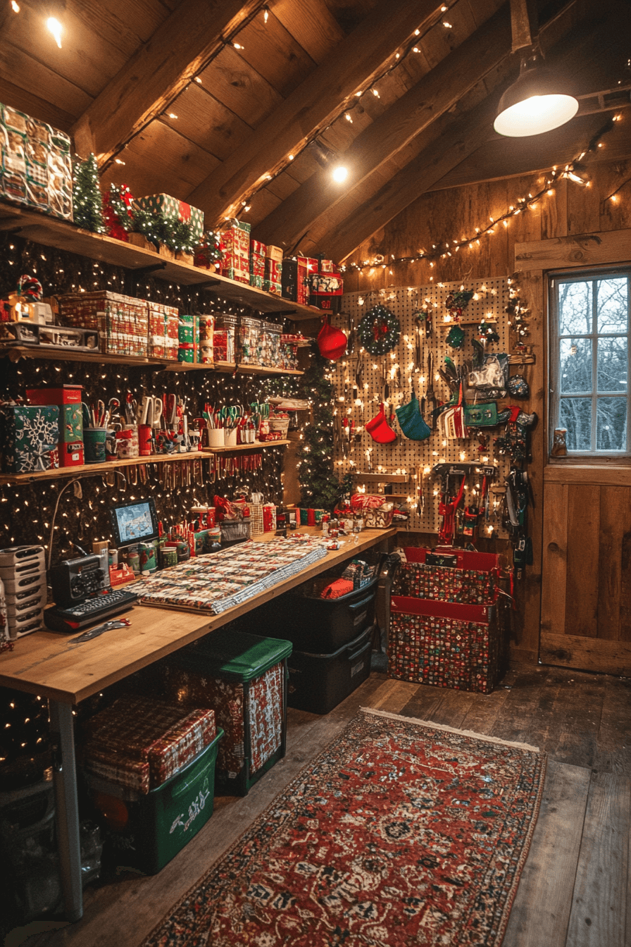 Turn your garage into a cheerful hub of creativity for your little cabin Christmas preparations. Tables lined with ribbons, wrapping paper, and tags make gift-wrapping easy and fun. Strings of lights and upbeat music keep energy high. Every package feels extra special when crafted here.