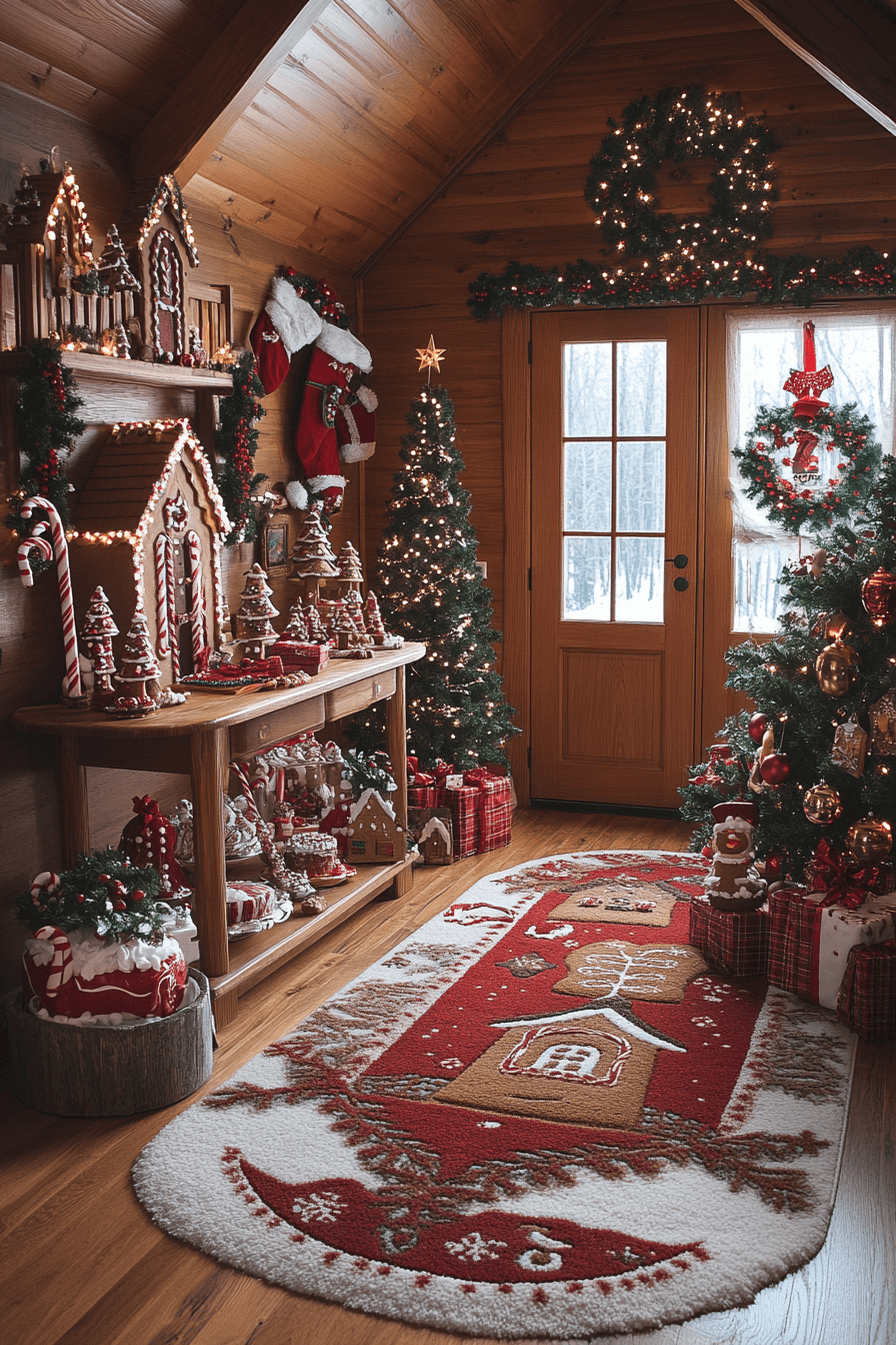 Welcome guests with sweetness and style in a foyer inspired by your little cabin Christmas gingerbread dreams. Candy-cane stripes, glowing lights, and warm brown hues create cozy charm. A table of treats and cocoa greets everyone with delight. The air smells of sugar and spice, wrapping visitors in warmth.