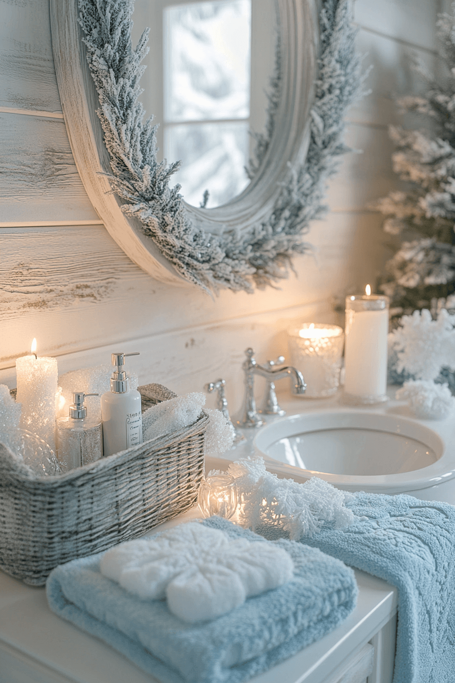 Bring icy elegance to your bathroom with a little cabin Christmas winter wonderland design. Cool blue accents, snowflake patterns, and soft candles create a frosty retreat. Crisp white towels and silver details make the space sparkle. Every glance feels like stepping into a serene snow scene.