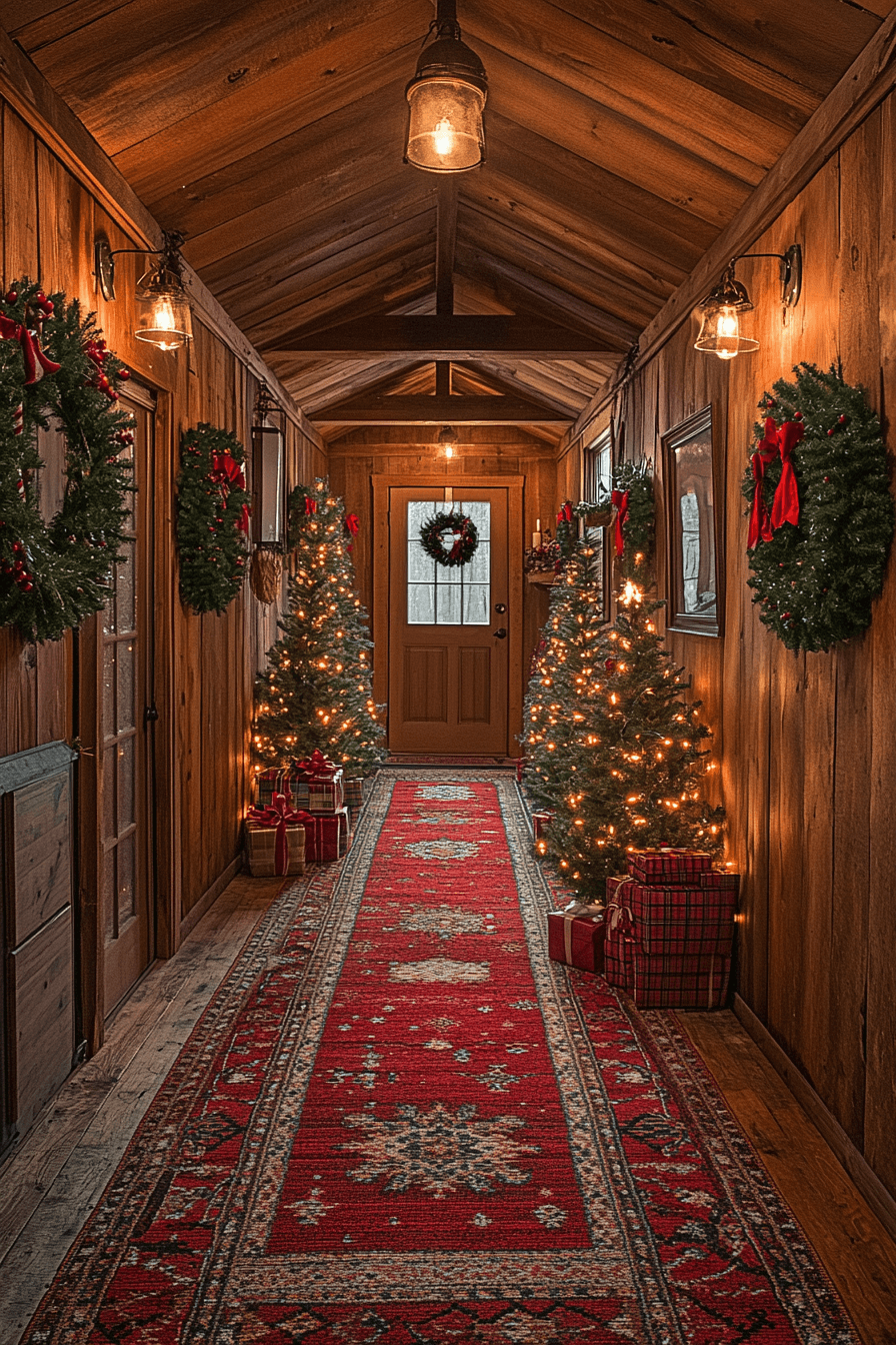 Fill your hallway with holiday charm that celebrates your little cabin Christmas spirit. Mini trees, twinkling lights, and festive wreaths line the path with joy. A red-and-green runner ties the space together perfectly. Warm lighting casts a golden glow over cheerful wall art.