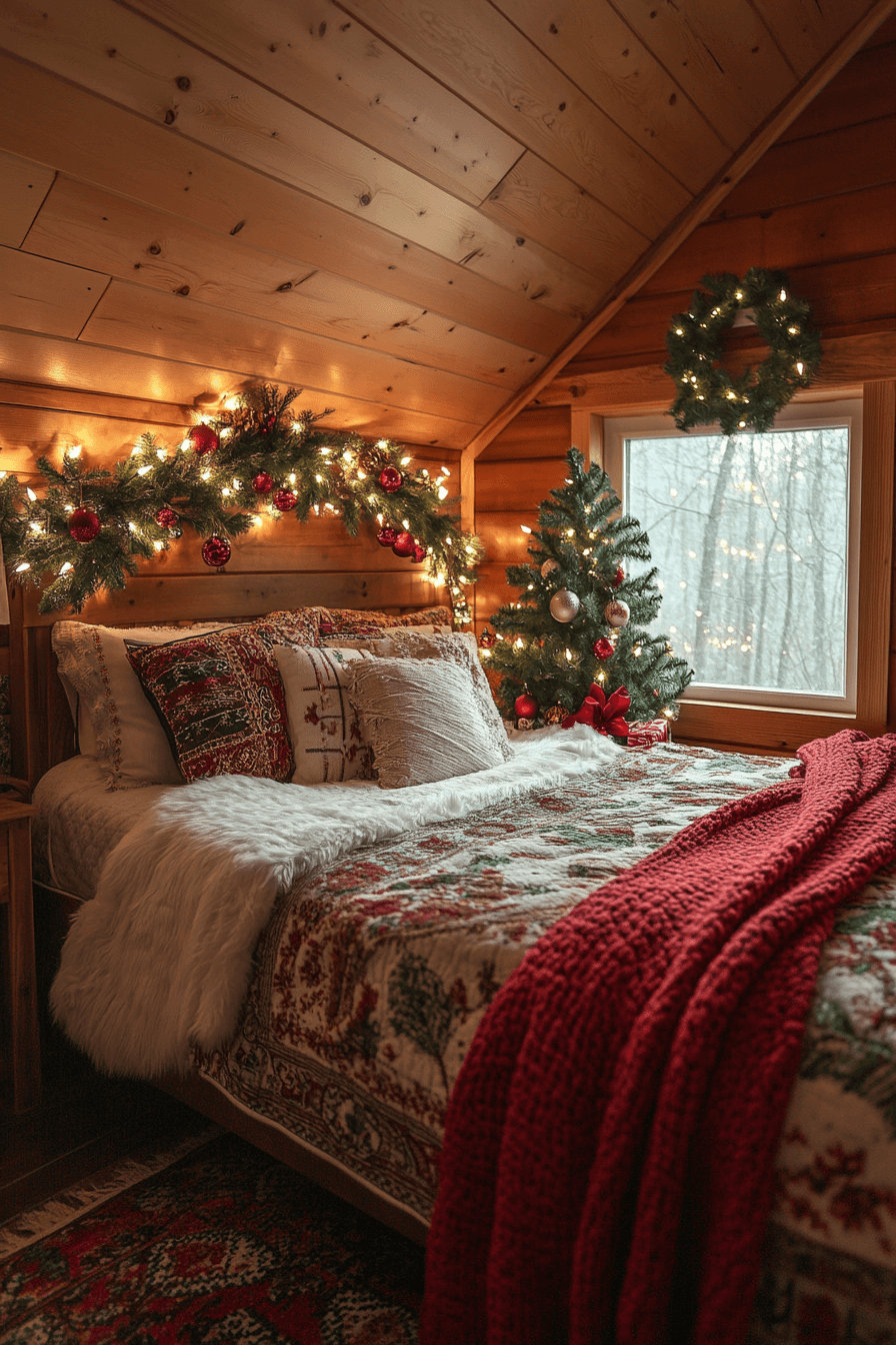 Turn your bedroom into a cozy haven filled with the spirit of your little cabin Christmas. Twinkle lights, festive linens, and a mini tree by the bed create a storybook charm. The scent of pine and cinnamon lingers in the air, wrapping the room in warmth. Layers of soft blankets make it the ultimate snuggle zone.