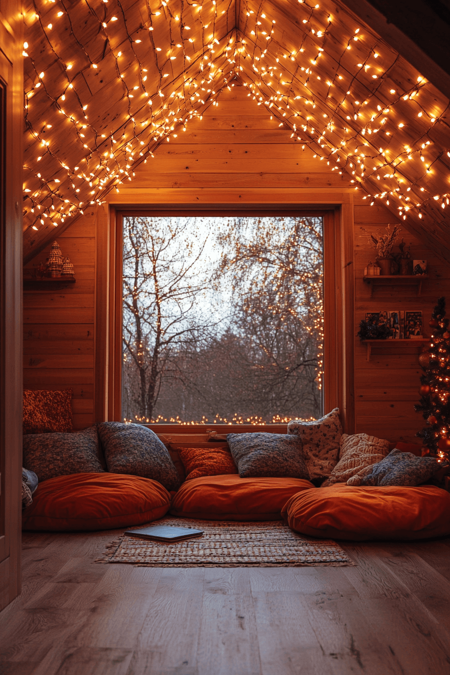 Transform your loft into a glowing hideaway that radiates the joy of a little cabin Christmas. Strings of lights twinkle across rustic beams, making the ceiling sparkle like a winter sky. Cushions, blankets, and laughter fill the air with cozy energy. The simple décor keeps the focus on the glowing ambiance.