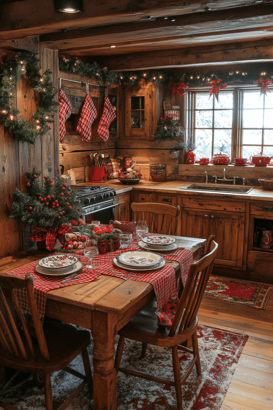 Celebrate togetherness in a kitchen made for a little cabin Christmas filled with warmth and cheer. Natural wood tones, red accents, and festive details create the perfect backdrop for baking and bonding. The smell of cookies and cocoa fills the space with comfort. Simple greenery and holiday touches make it beautifully effortless.