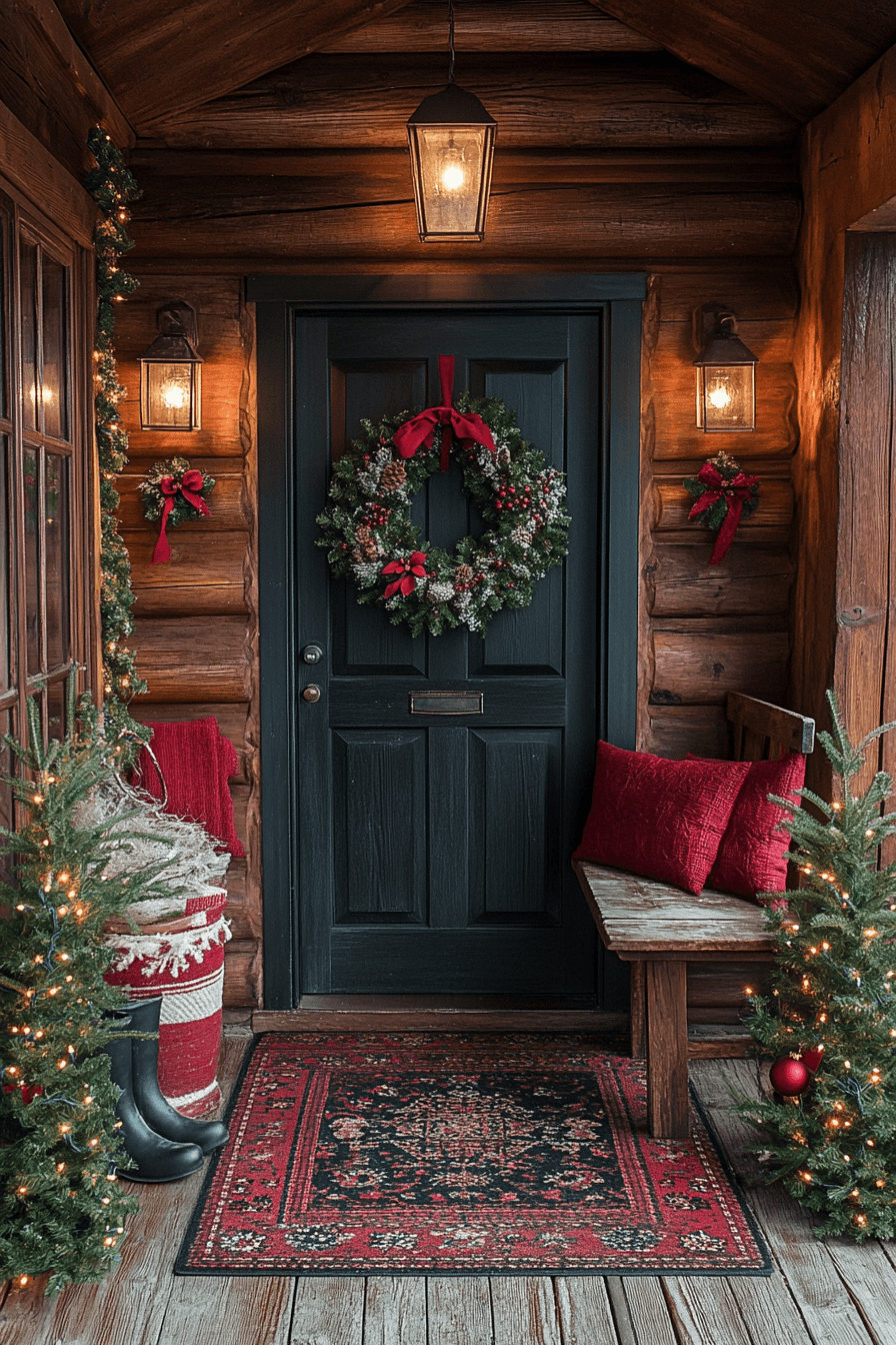Keep your mudroom cheerful and tidy with the charm of a little cabin Christmas. Festive baskets, ribboned hooks, and cozy cushions create a functional yet fun space. A bright holiday mat welcomes everyone home with joy. Wreaths and greenery tie the whole look together.