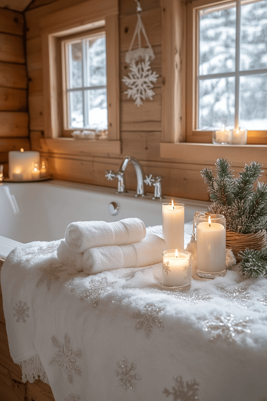 Escape to an Alpine-inspired bathroom that feels like a snow-kissed retreat for your little cabin Christmas. White towels, silver accents, and frosty details reflect winter’s sparkle. A small tree and scented candles bring warmth and serenity. Every surface feels fresh, clean, and delightfully festive.