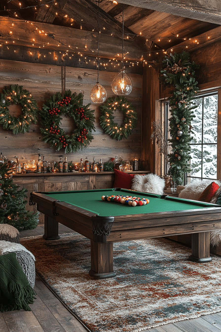 Turn your game room into a playful wonderland glowing with little cabin Christmas joy. A pool table with green felt, garlands, and string lights sets the holiday mood. Comfy seats and soft blankets keep everyone cozy between turns. Snacks and hot cocoa complete the cheerful atmosphere.