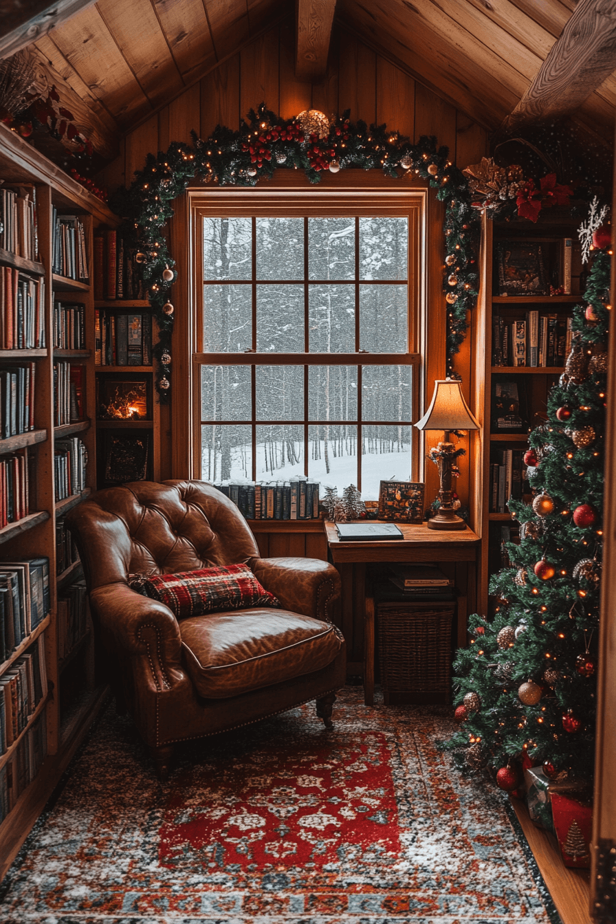 Find peace in a study designed for your little cabin Christmas reflections. A soft lamp, cozy chair, and garland-wrapped desk set the tone for calm and creativity. The snow outside your window adds quiet inspiration. A tiny fir tree glows gently in the corner.