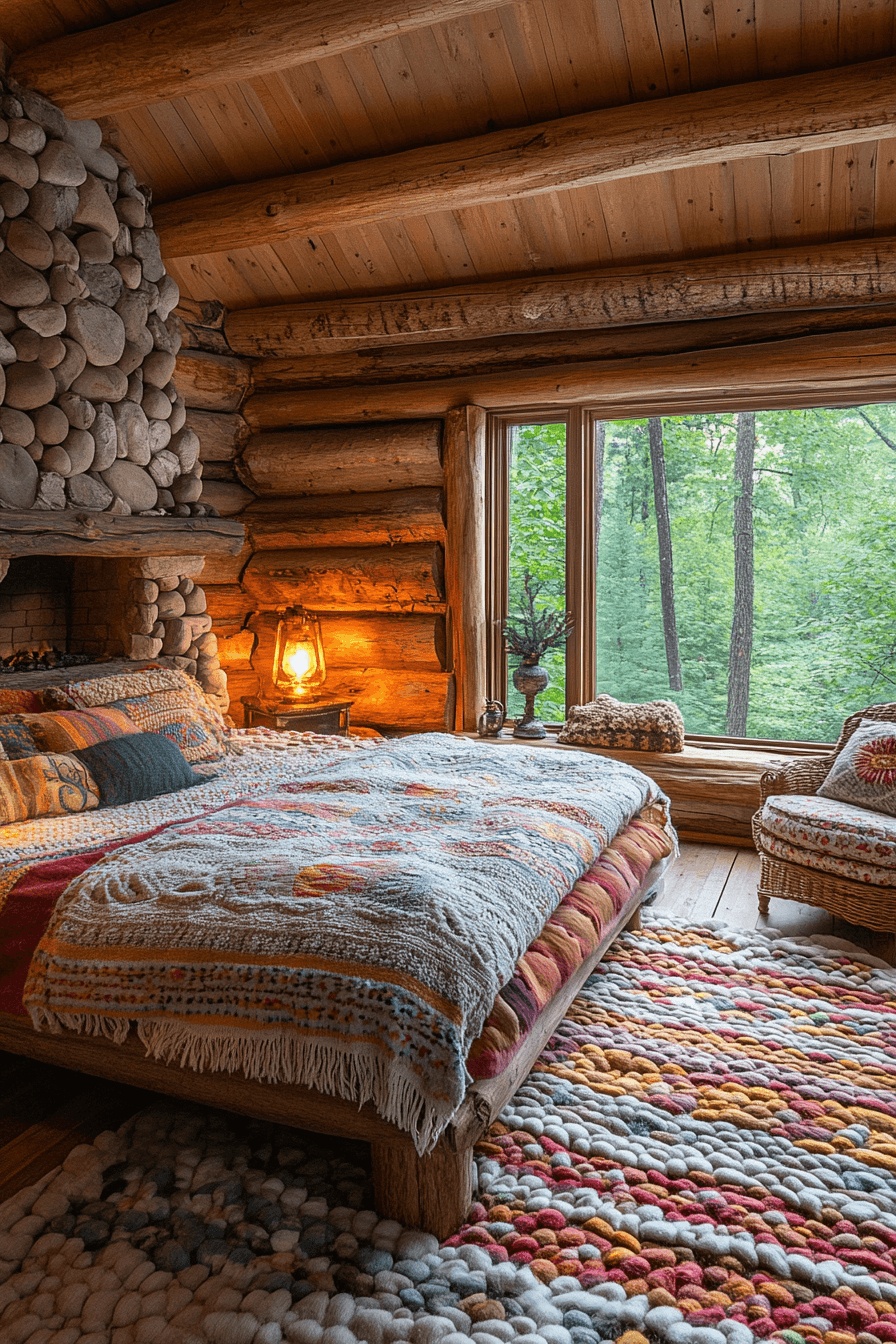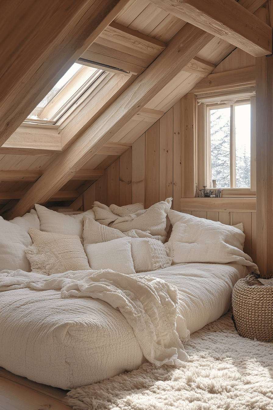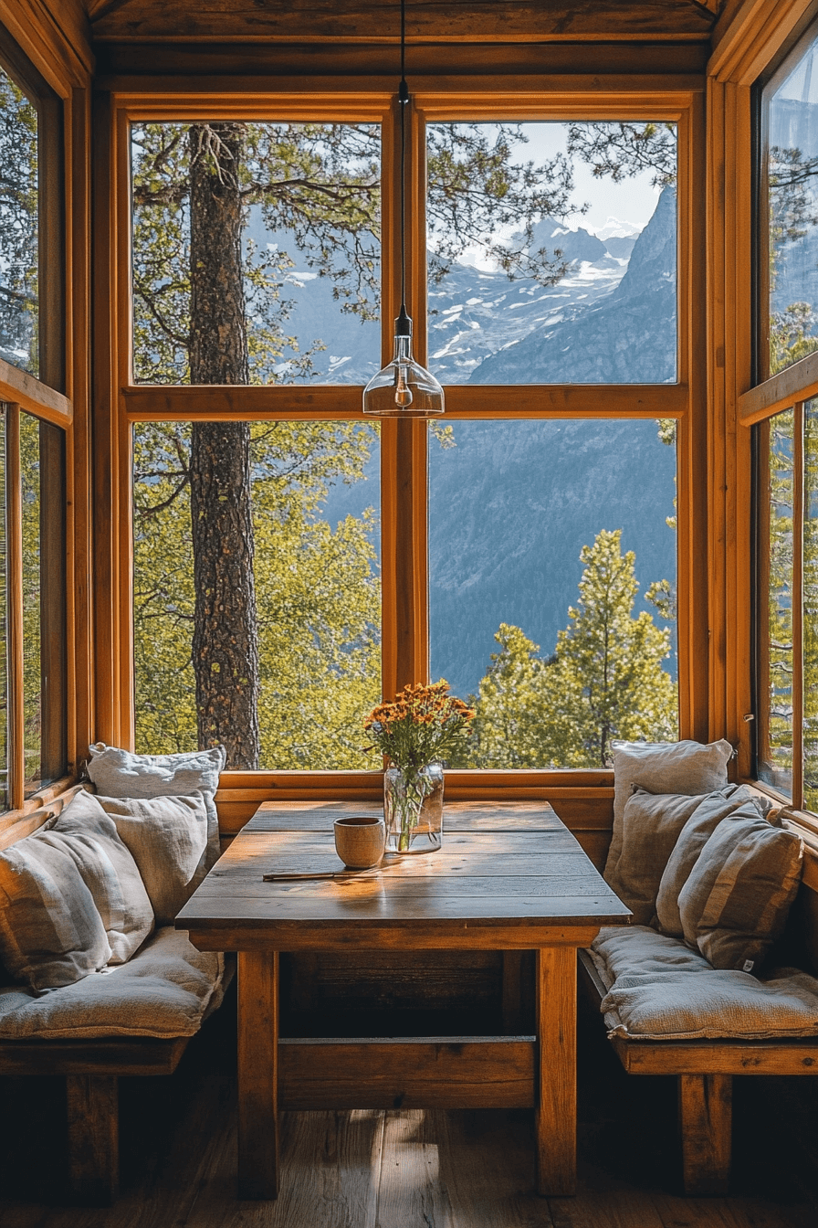 Start your day surrounded by light and nature with little cabin decor inspired by mountain mornings. Airy curtains, simple furnishings, and natural wood keep the focus on the scenery. Gentle pastels mimic dawn’s first glow, creating a soft and refreshing ambiance. A window nook becomes the best seat in the house.