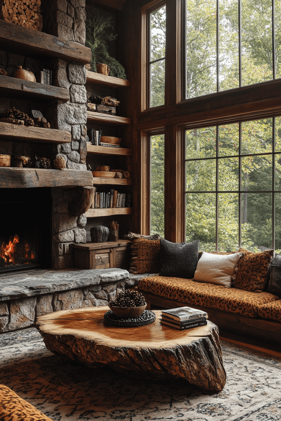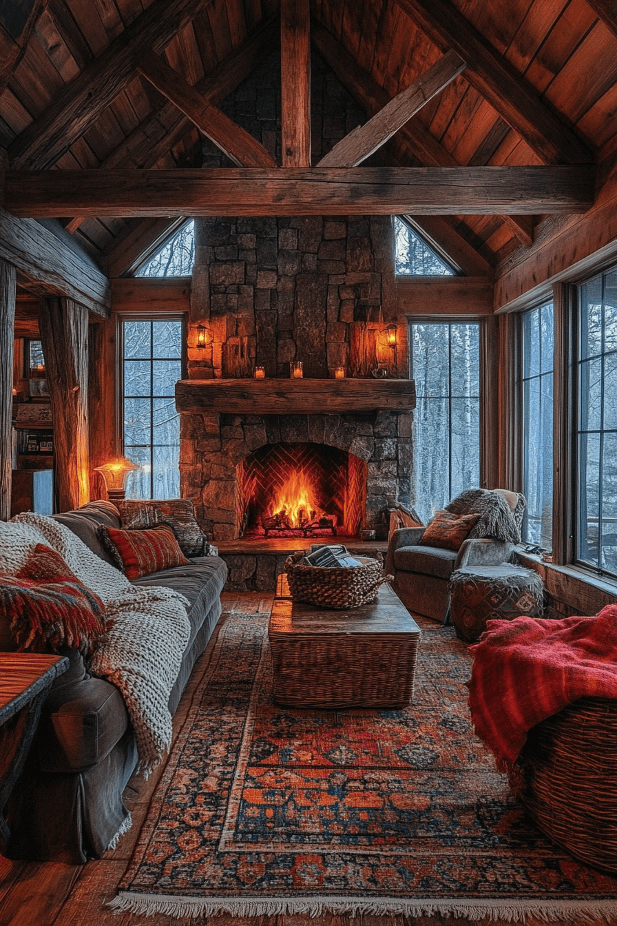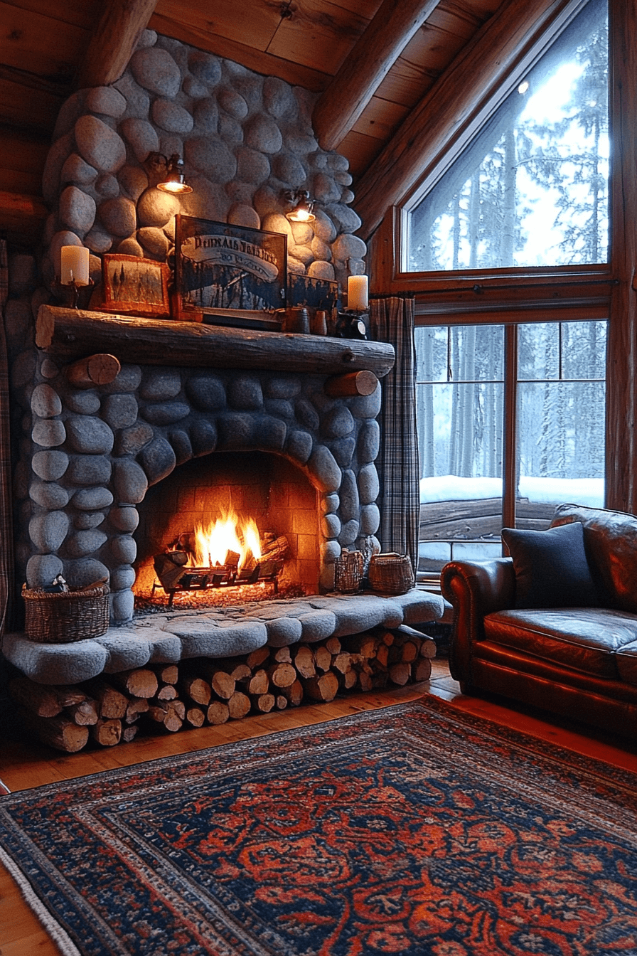 Wrap yourself in comfort with little cabin decor built around the magic of a glowing fire. Deep wood tones, plush chairs, and flickering light create the perfect relaxation zone. The scent of pine and the crackle of burning logs make every night special. Metal tools and natural stone keep the look authentic.