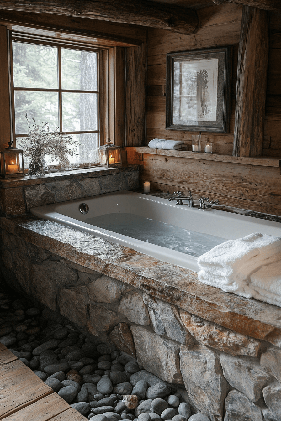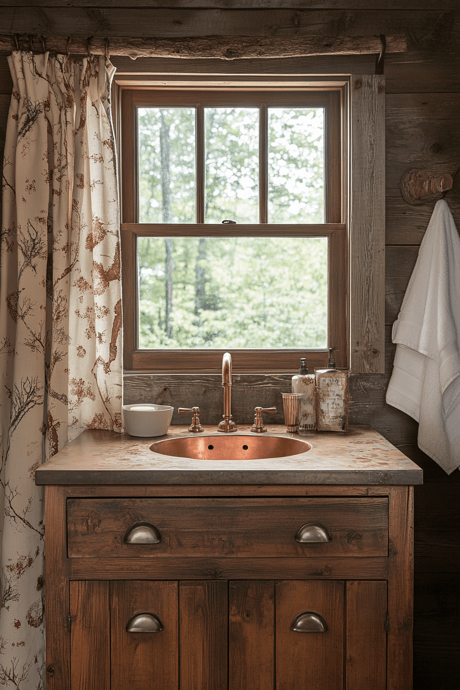 Turn your bathroom into a rustic spa retreat with little cabin decor inspired by the wilderness. Wood-grain walls, copper fixtures, and river-stone accents set a tranquil mood. Neutral towels and soft lighting make the space feel luxurious. It’s a balance of function and nature at its best.