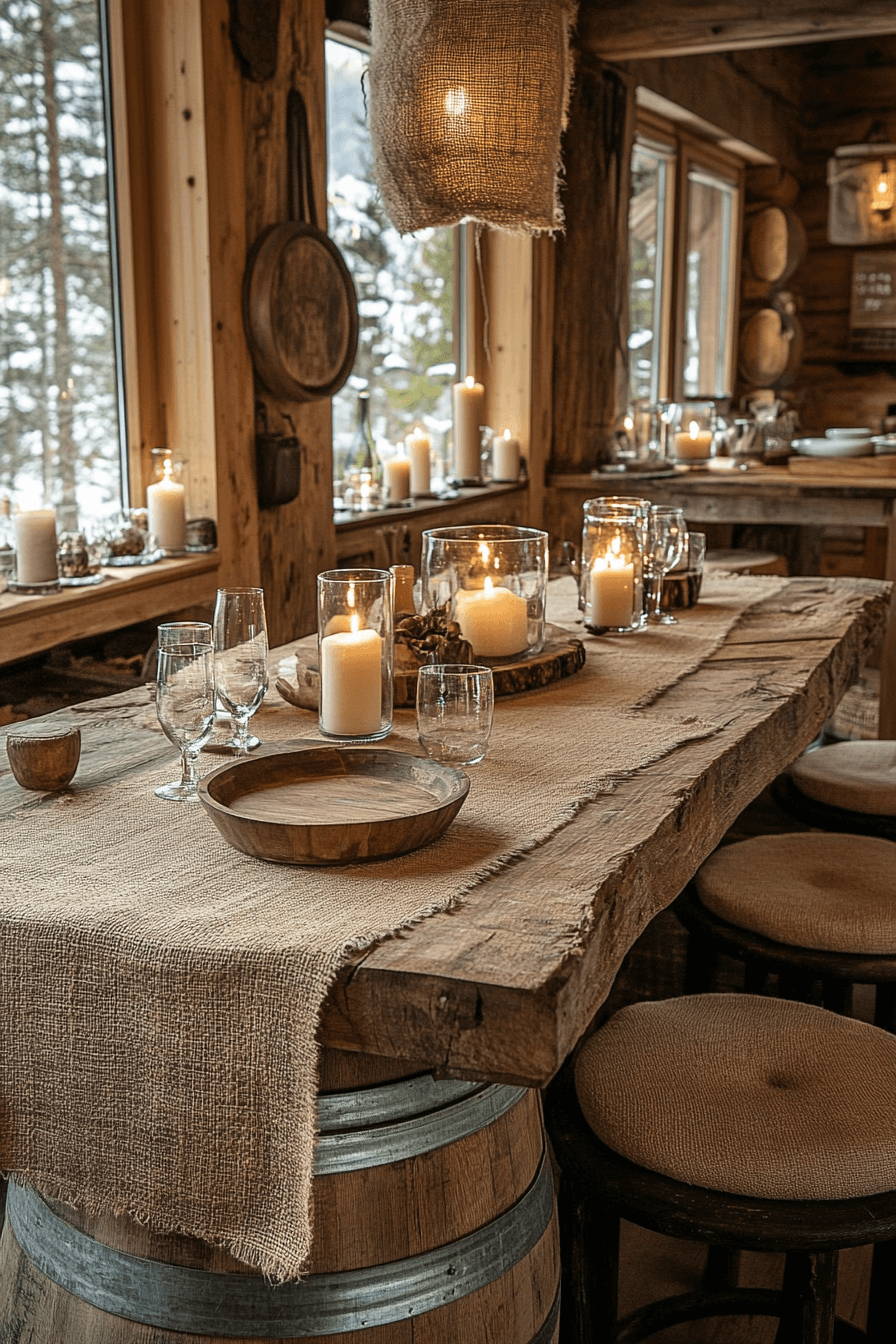 Sustainability meets creativity in little cabin decor featuring barrels and burlap. Repurposed materials like old casks and rustic textiles create eco-friendly elegance. Burlap curtains and barrel tables add handcrafted charm. It’s a perfect mix of resourcefulness and style.