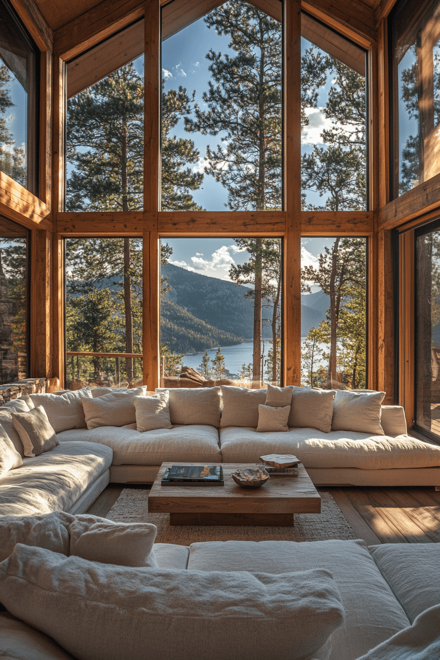 Highlight your natural surroundings with little cabin decor that celebrates panoramic views. Floor-to-ceiling windows and mirrored surfaces expand the scenery. Neutral interiors keep the spotlight on the landscape outside. Every glance feels like art in motion.