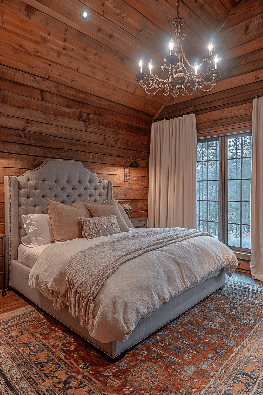 Add luxury to the wild with little cabin decor that brings elegance to your bedroom. Silk bedding, ornate mirrors, and soft drapes combine with rustic woods for balance. Warm lighting and textured accents make the space glow. The result is pure comfort with a hint of glam.